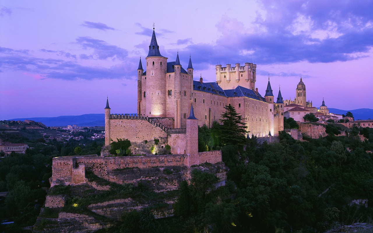 Description: A castle with a clock tower and a tower on top of it at dusk with a purple sky in the background.