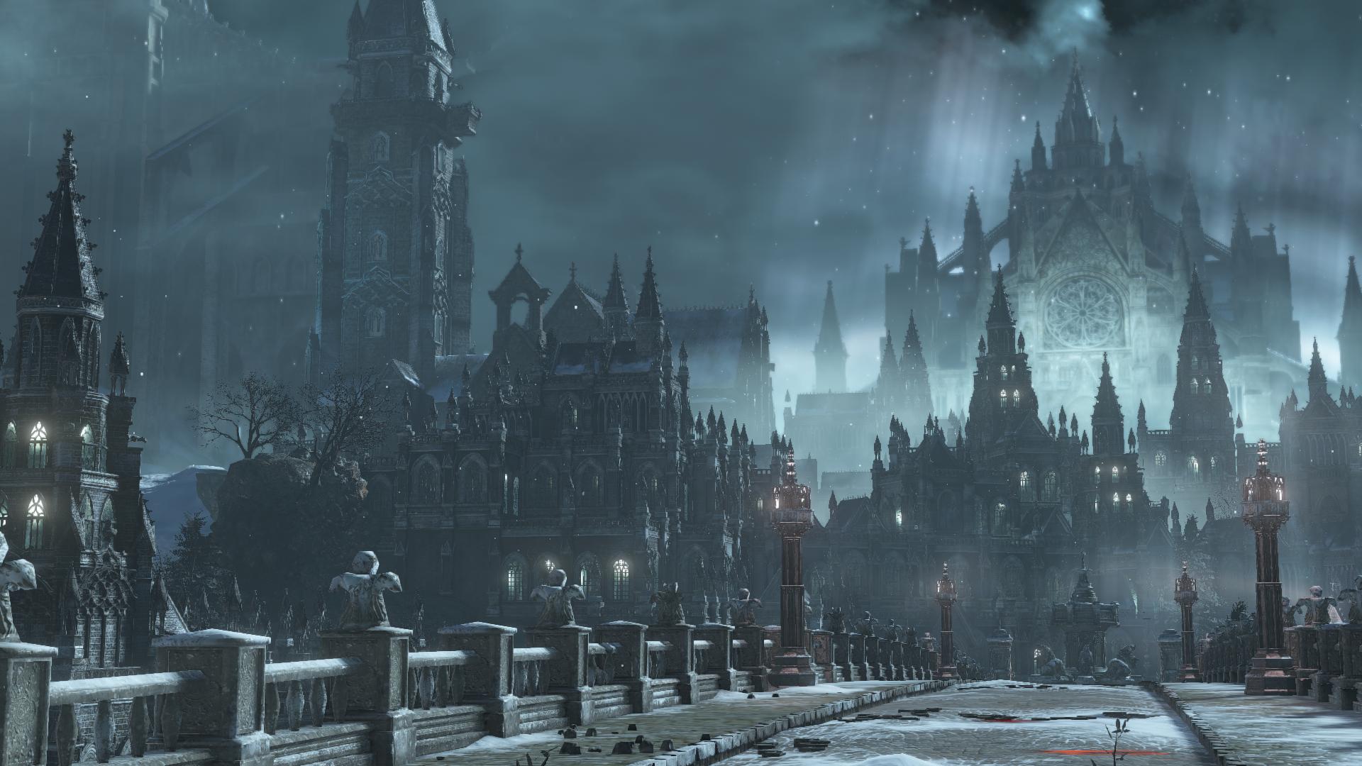 Description: A large castle with a clock tower in the middle of it at night time with a lot of fog.