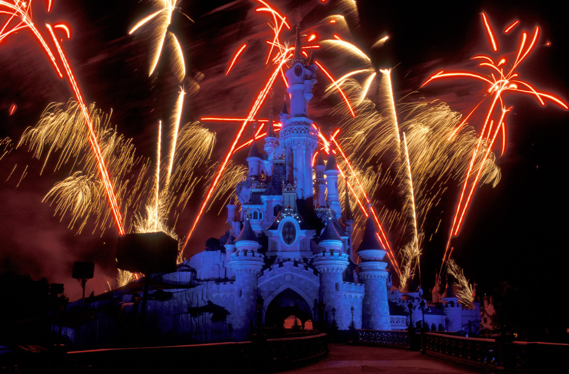 Description: A castle with fireworks in the sky and a castle in the background with a lot of lights on it.