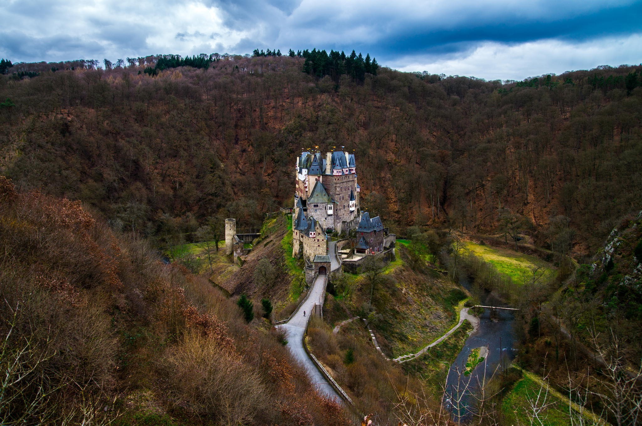 Description: A castle in the middle of a forest with a river running through it and a road going through it.