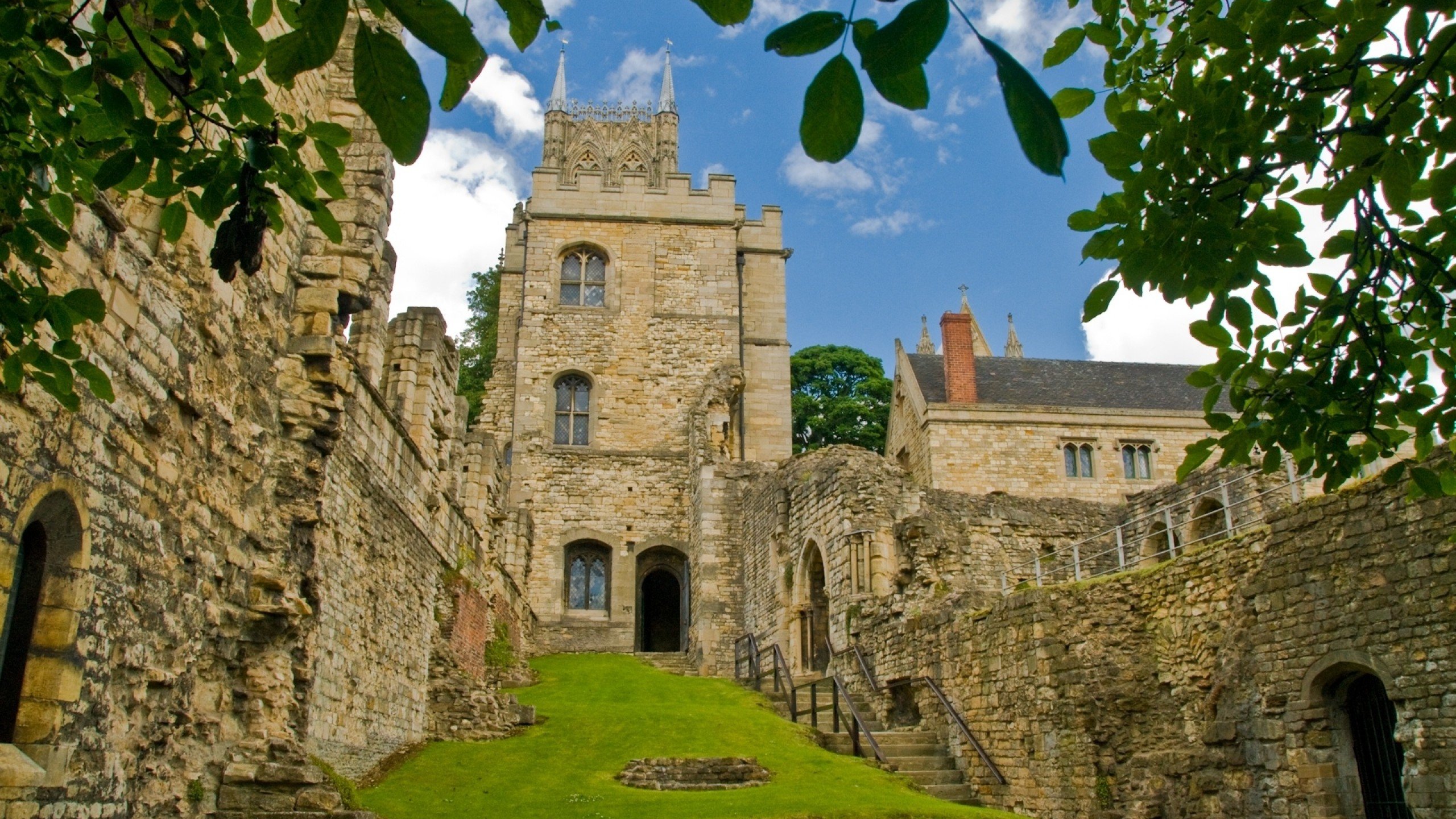 Description: A castle with a grassy lawn and stairs leading to it's entrance and a clock tower in the background.