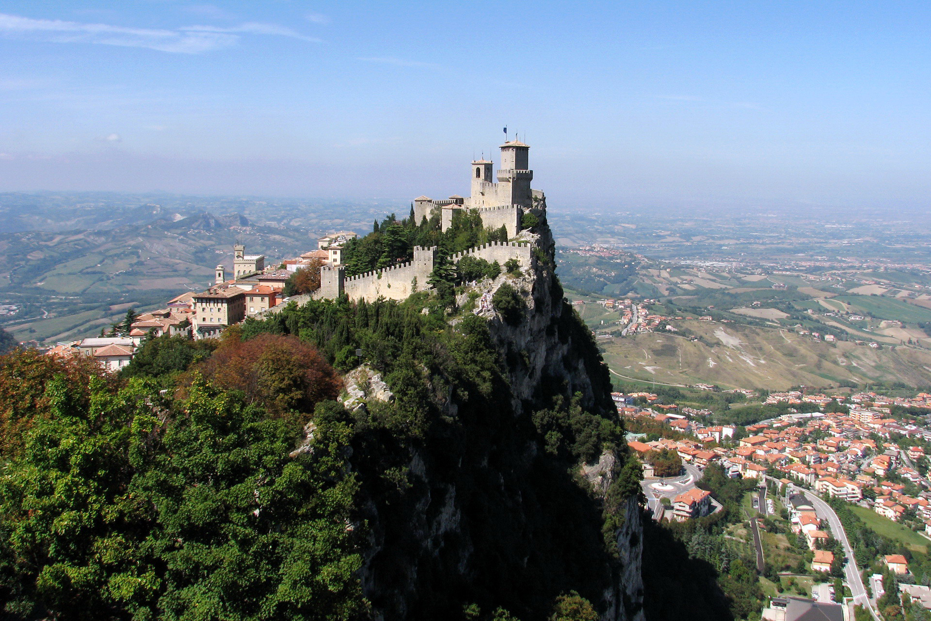 Description: A castle on a hill with a city below it and a valley below it with trees and buildings below.