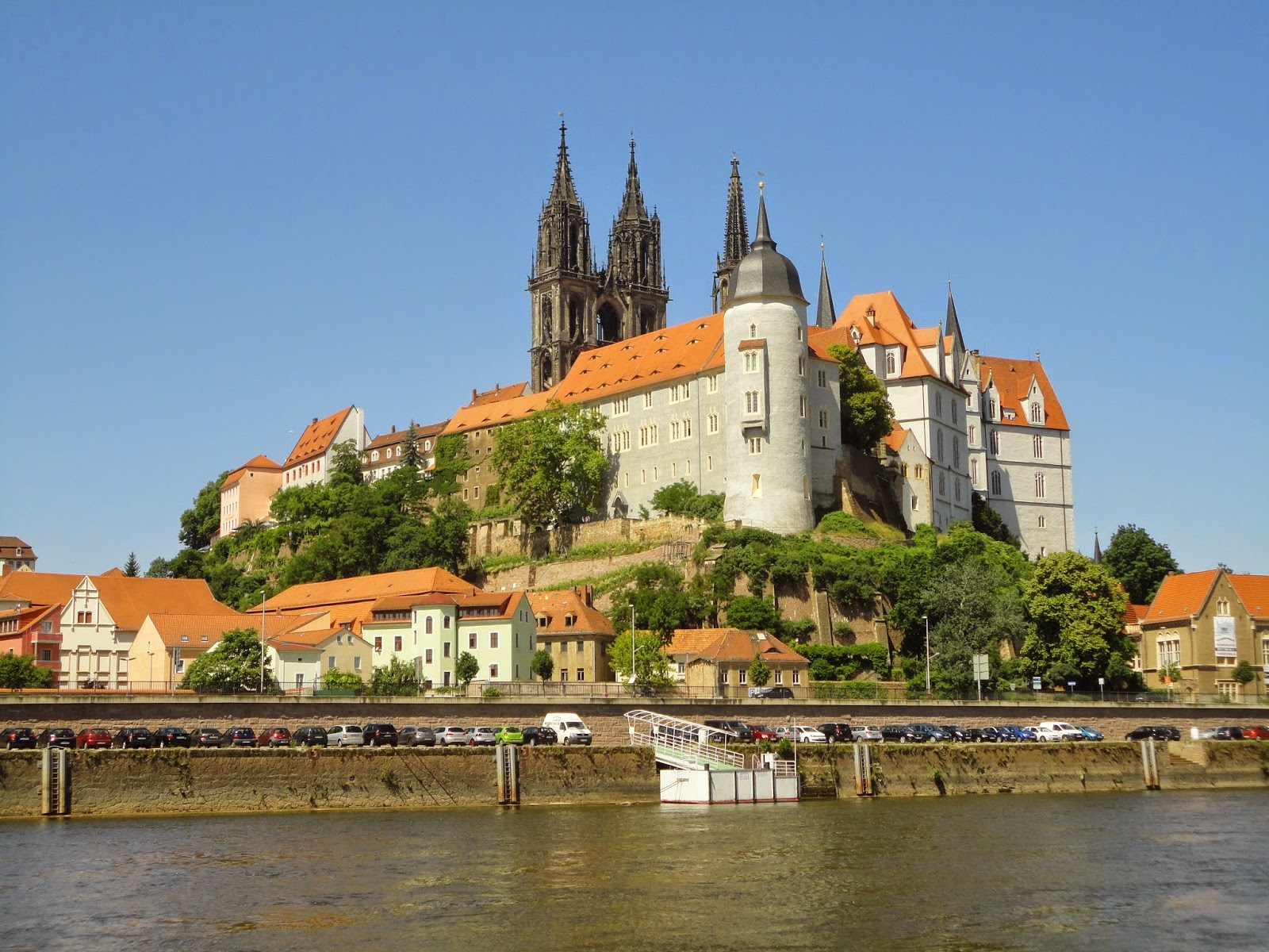 Description: A castle on a hill with a river below it and a bridge in front of it that leads to a boat dock.