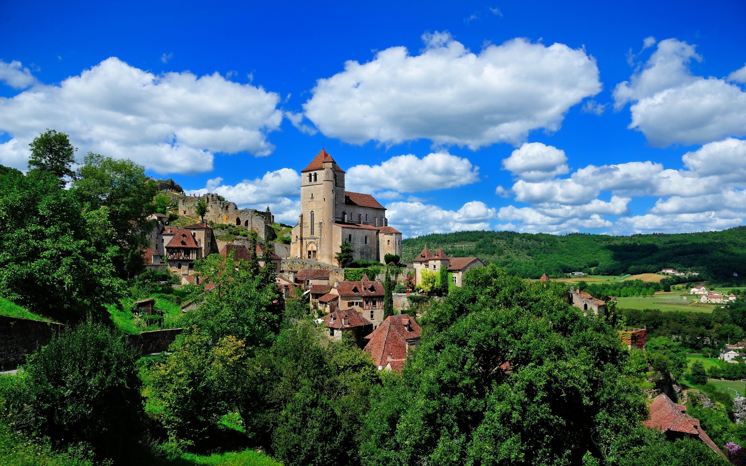 Description: A castle like building with a tower on top of a hill surrounded by trees and a valley below it.