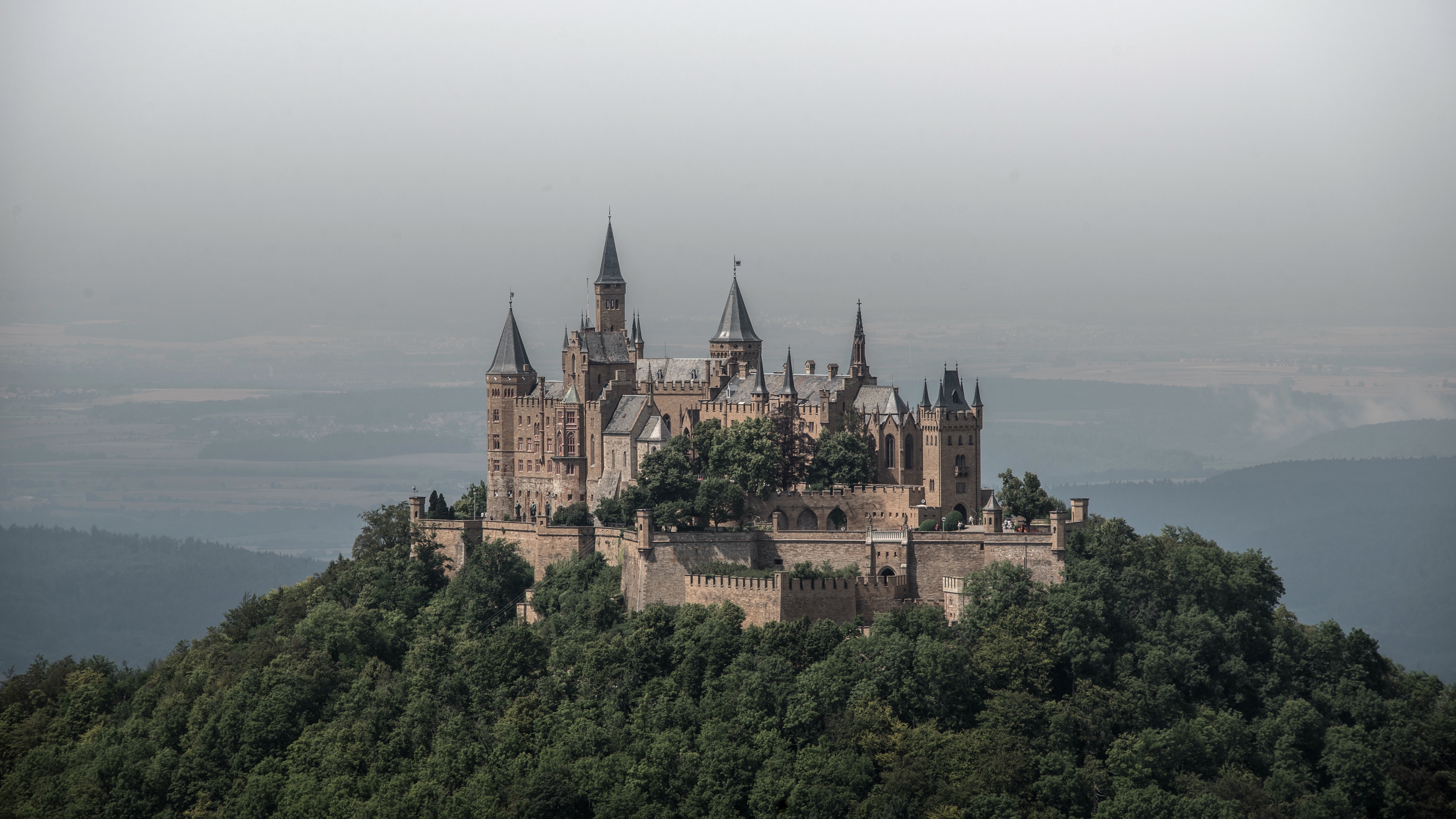 Description: A castle with towers on top of a hill surrounded by trees and hills in the background.