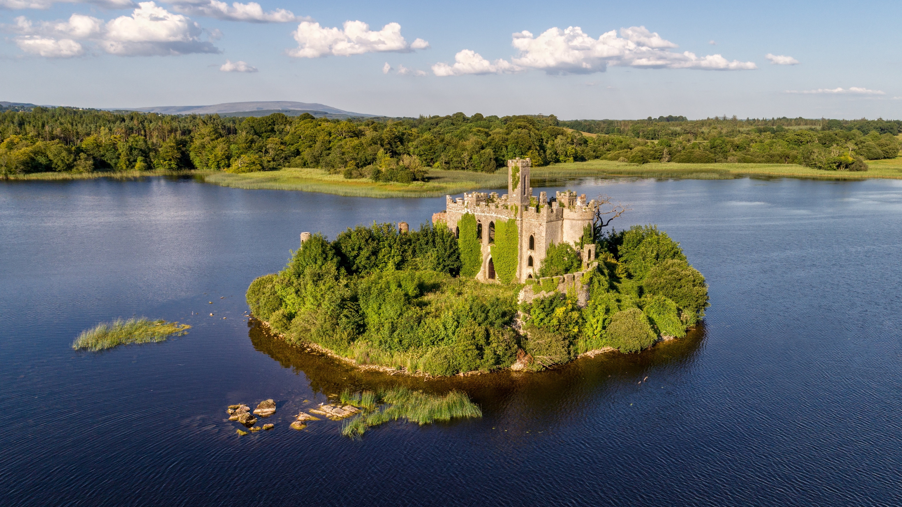 Description: A castle sits on an island in the middle of a lake surrounded by trees and grass.