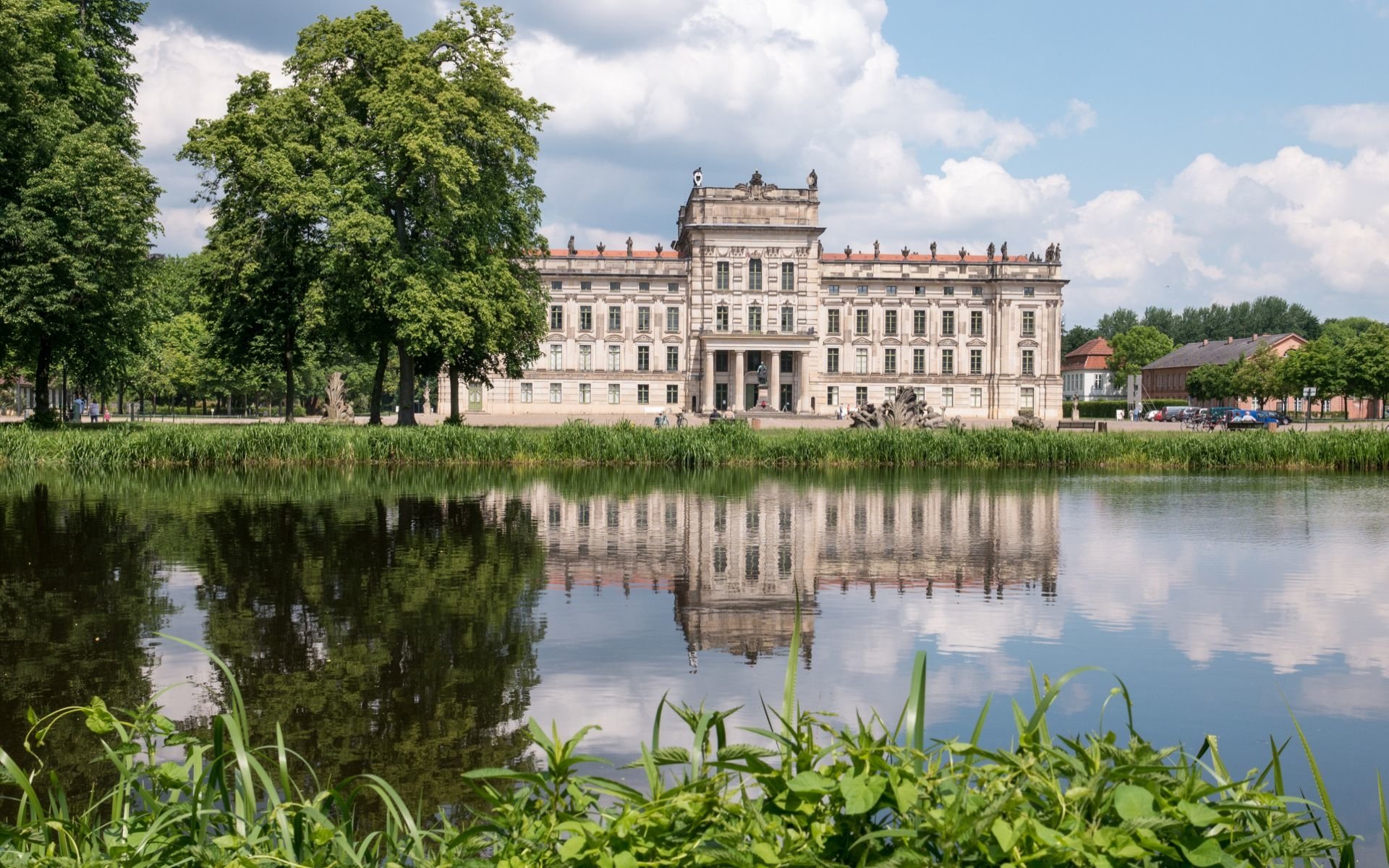 Description: A large building sitting next to a lake in front of a forest filled with trees and bushes on a cloudy day.