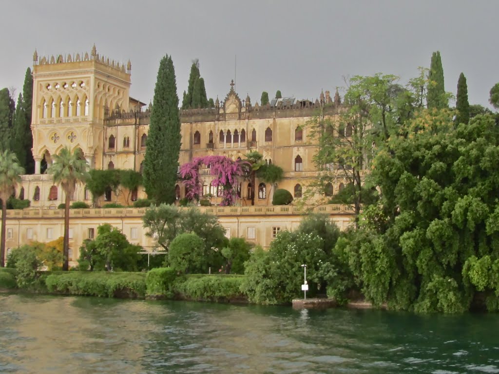 Description: A castle with a lake in front of it and trees around it and a boat in the water near by.