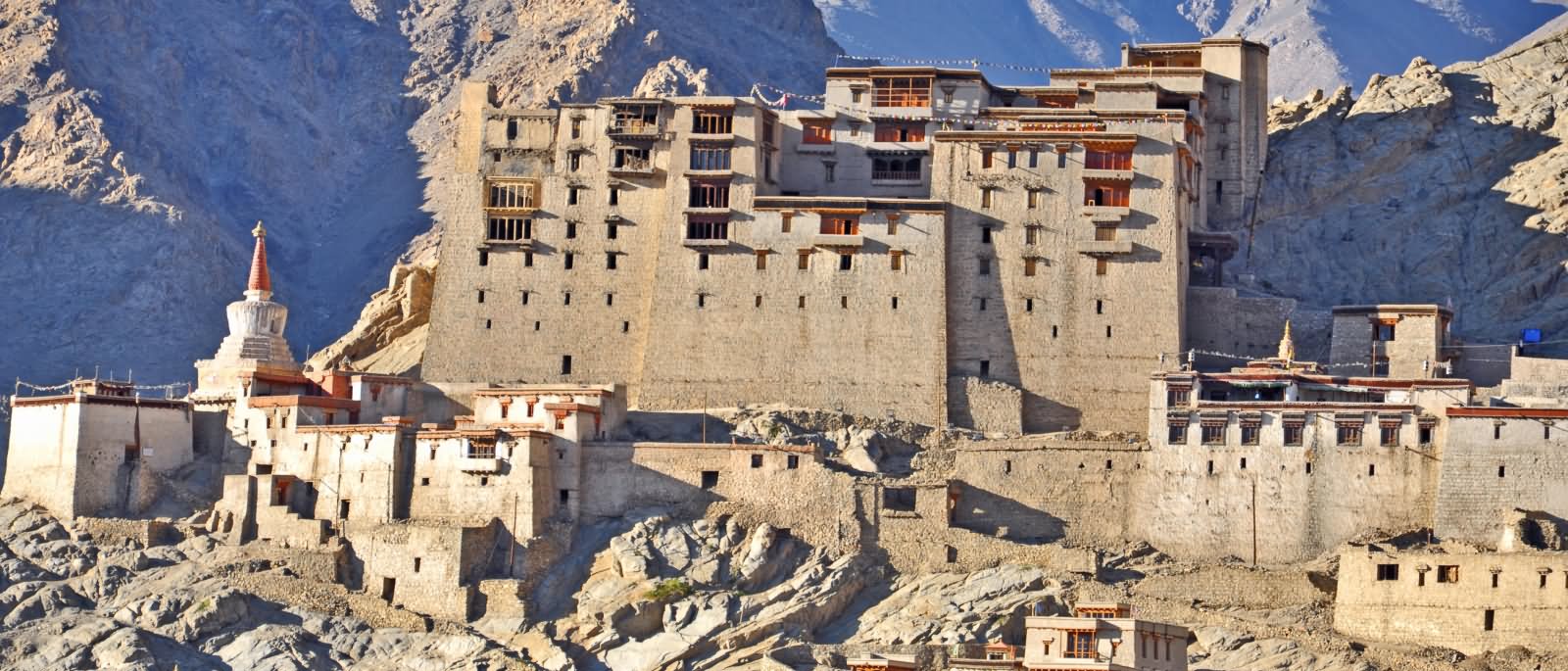 Description: A large castle like building on a mountain side with mountains in the background and a sky line in the foreground.