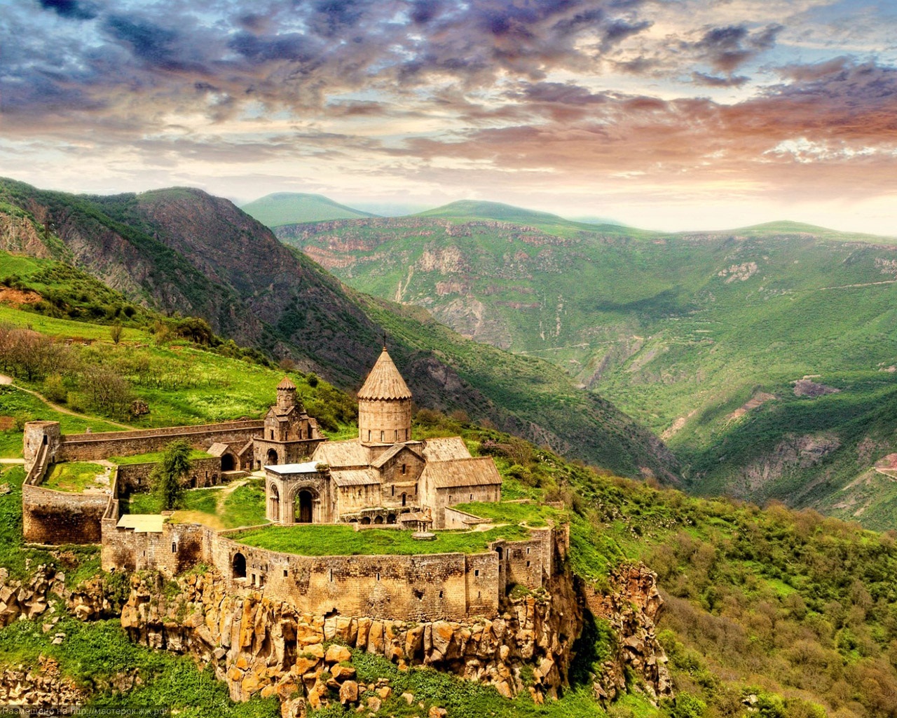 Description: A castle on a mountain with a view of the valley below it and mountains in the background with clouds.