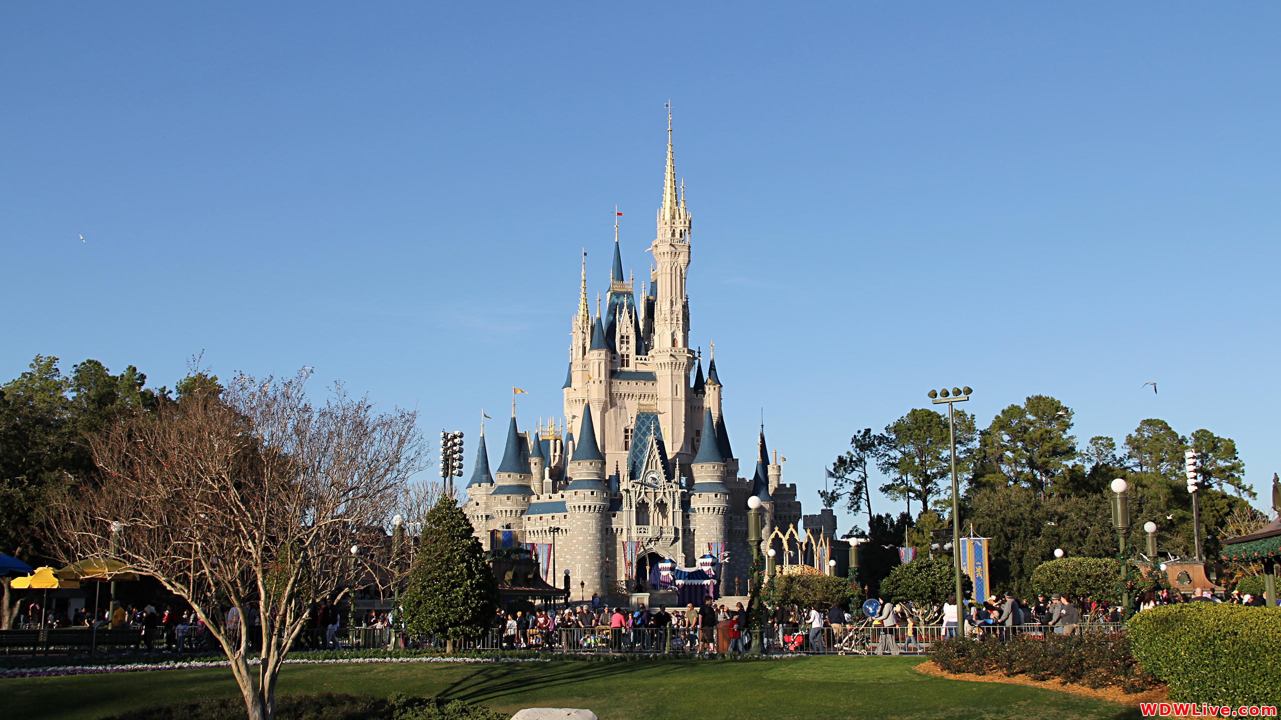 Description: A castle with a lot of people walking around it in front of it and a blue sky in the background.