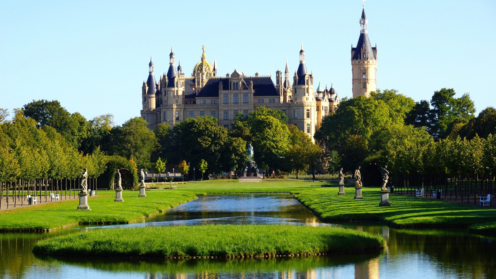 Description: A large castle with a pond in front of it and a statue in the middle of the pond in front of it.