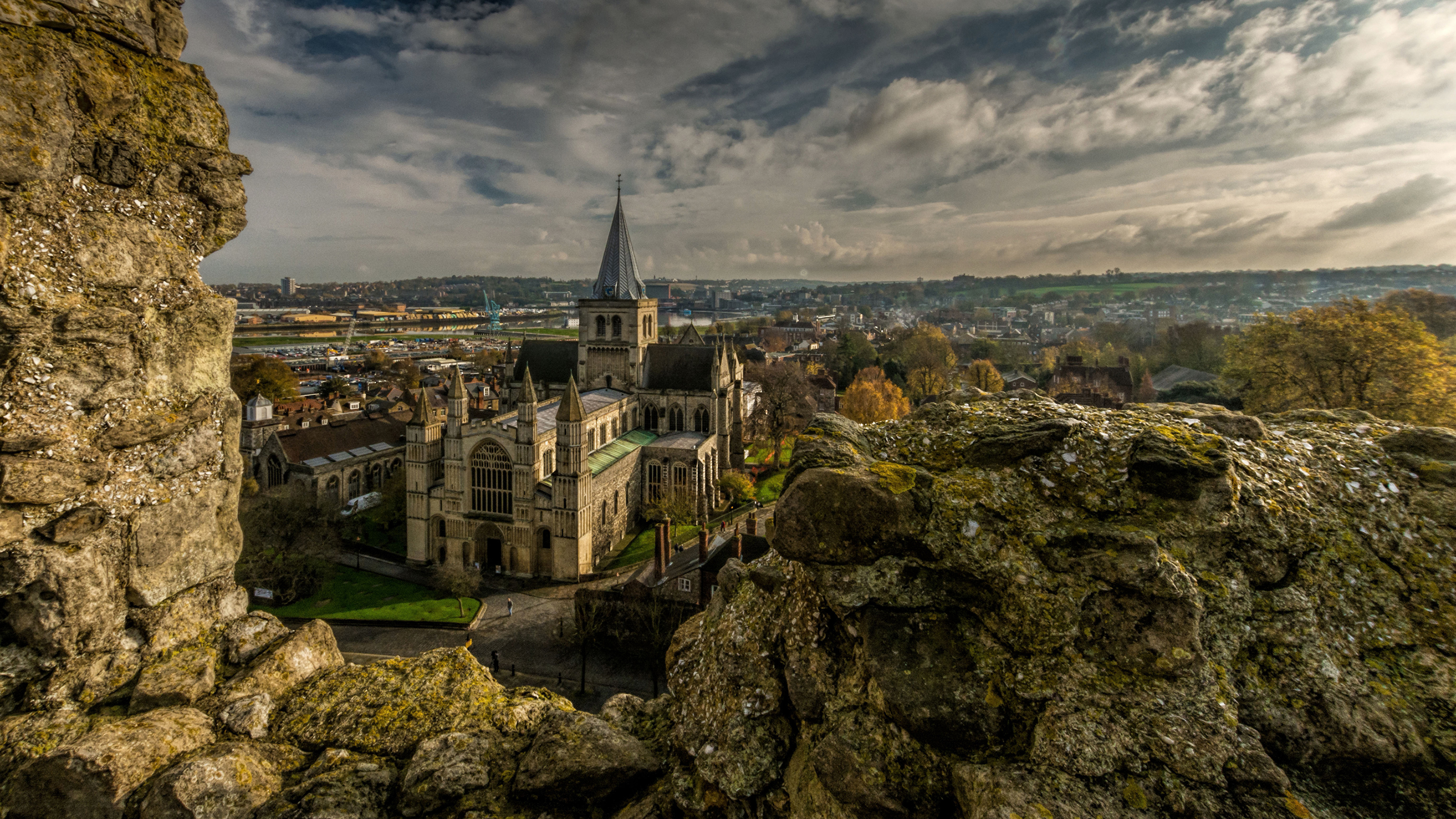 Description: A castle with a tower on top of a rocky hill with a city below it and a cloudy sky.