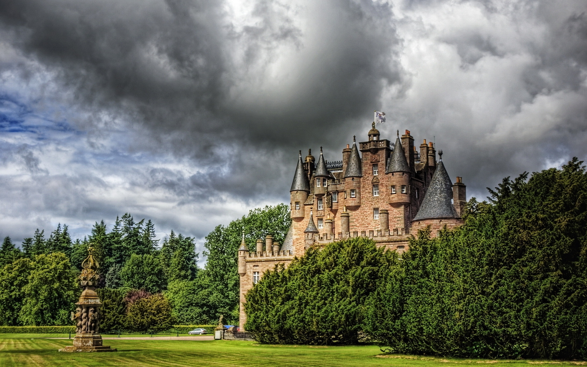Description: A castle with a cloudy sky in the background and trees in the foreground.