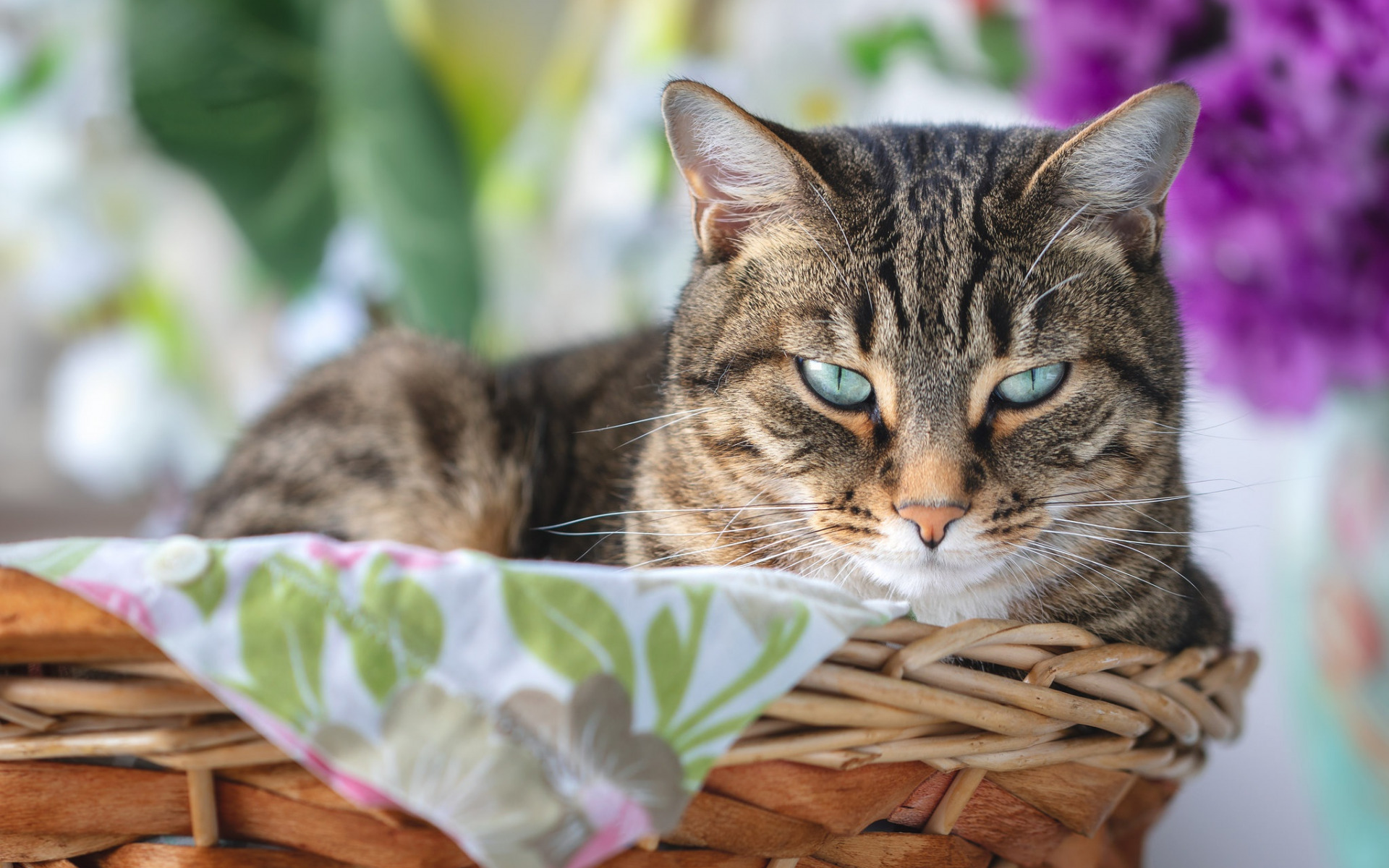 Description: A cat sitting in a basket with flowers in the background and a cloth on the floor next to it.