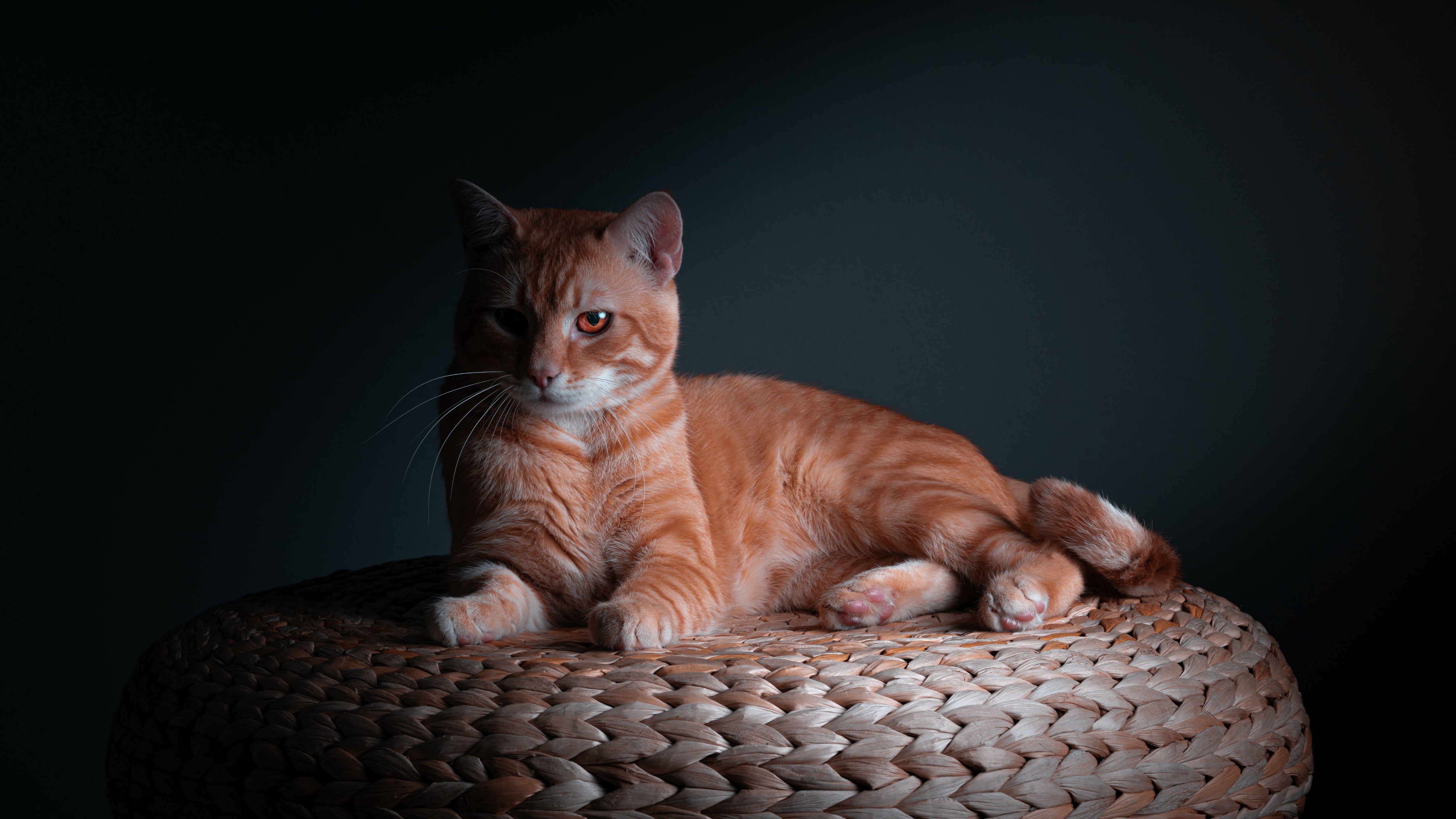 Description: A cat sitting on top of a woven basket on a table top with a black background in the background.