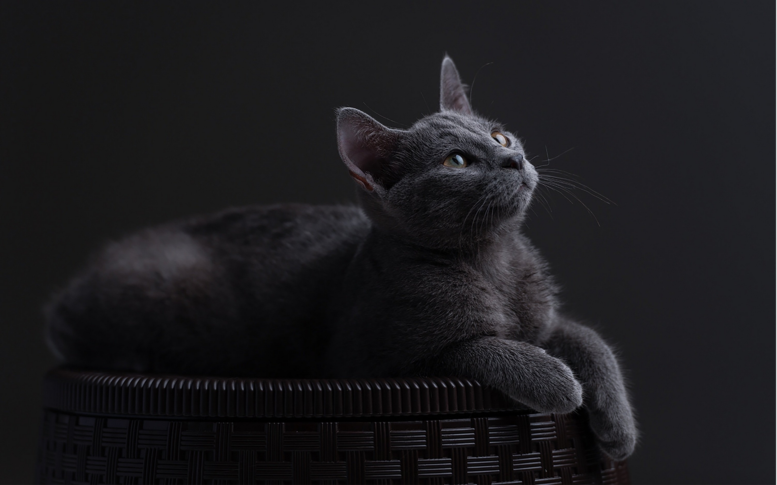 Description: A cat is sitting in a basket looking up at something in the air with its eyes wide open and a black background.