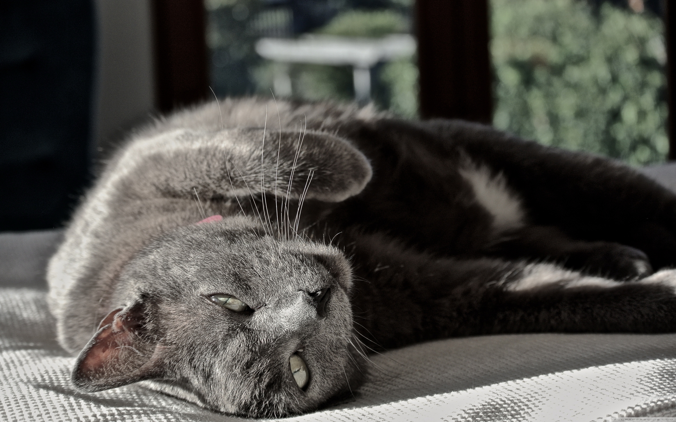Description: A cat laying on its back on a bed with its eyes closed and it's head resting on the pillow.