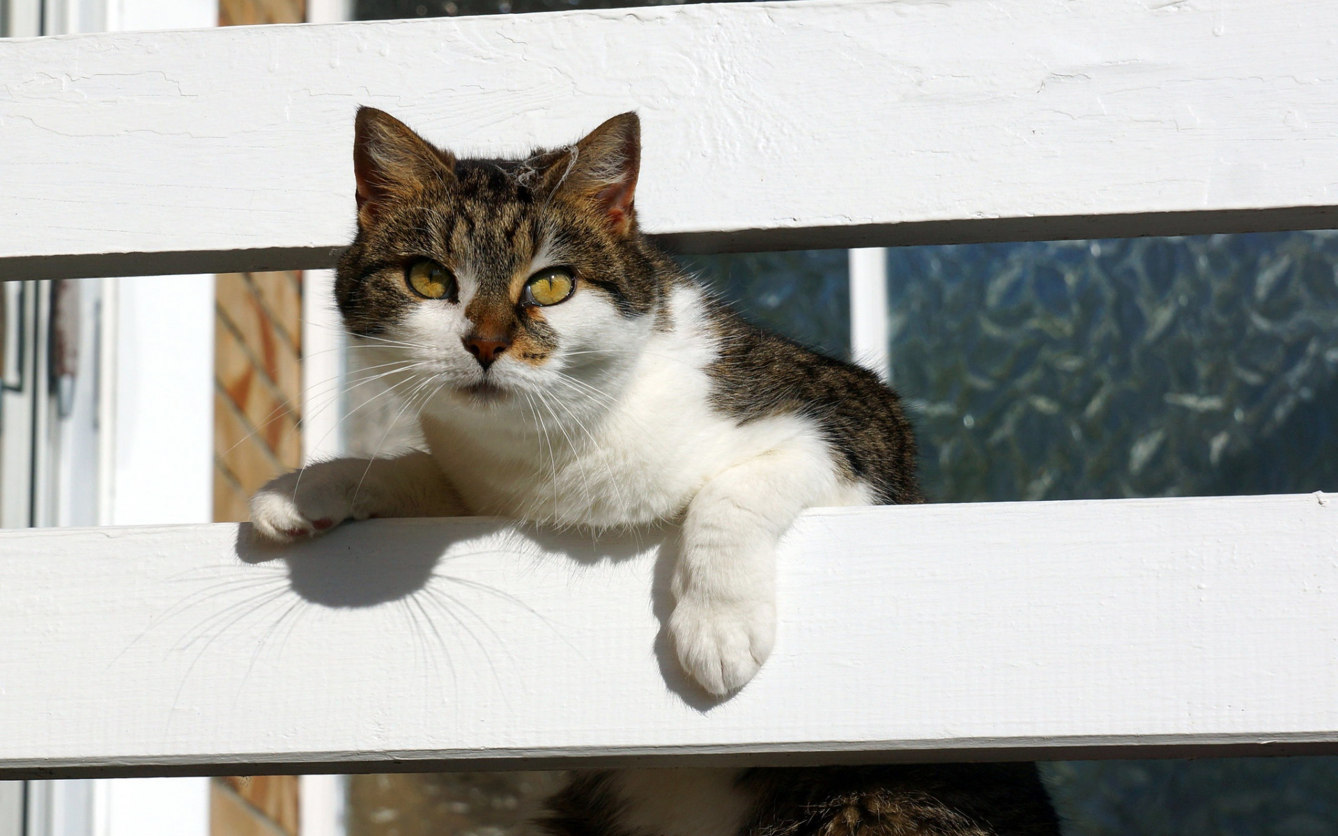 Description: A cat sitting on a white bench looking out the window of a house with a cat sitting on the ledge.