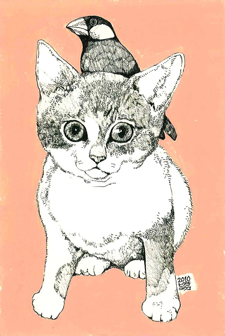 Description: A drawing of a cat with a bird on its head and a bird on its head on top of it.