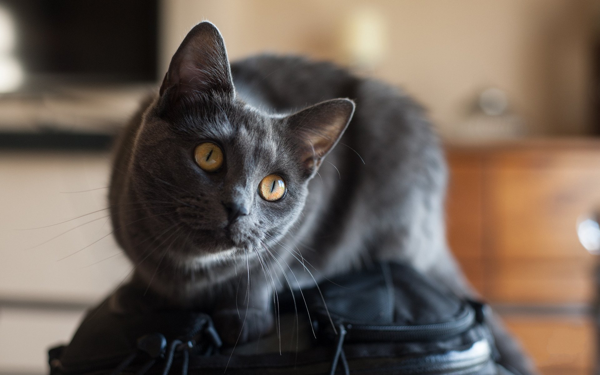 Description: A cat sitting on top of a black bag on a table next to a dresser and a chair with a wooden table.
