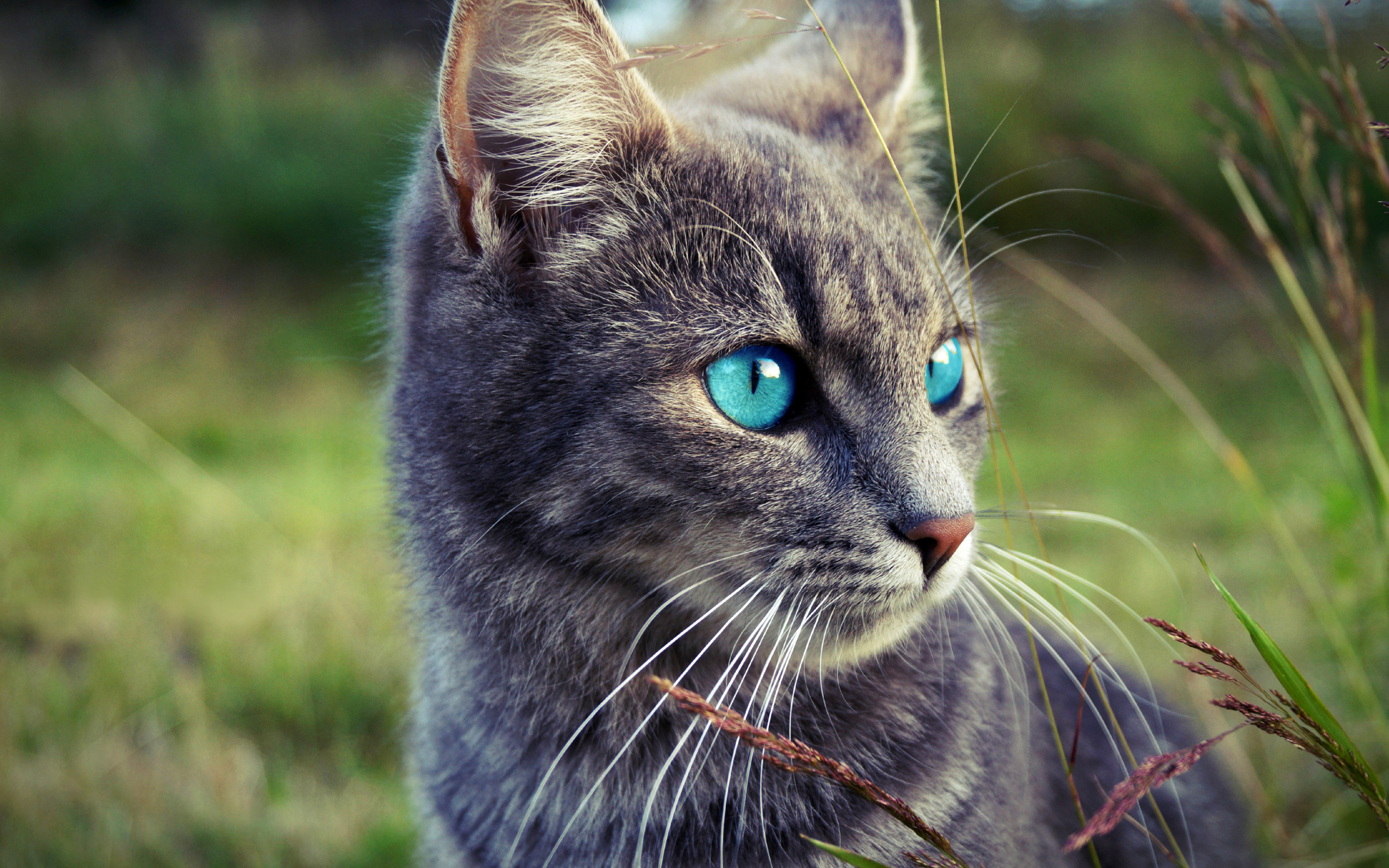 Description: A cat with blue eyes is standing in the grass and looking at something with a serious look on its face.