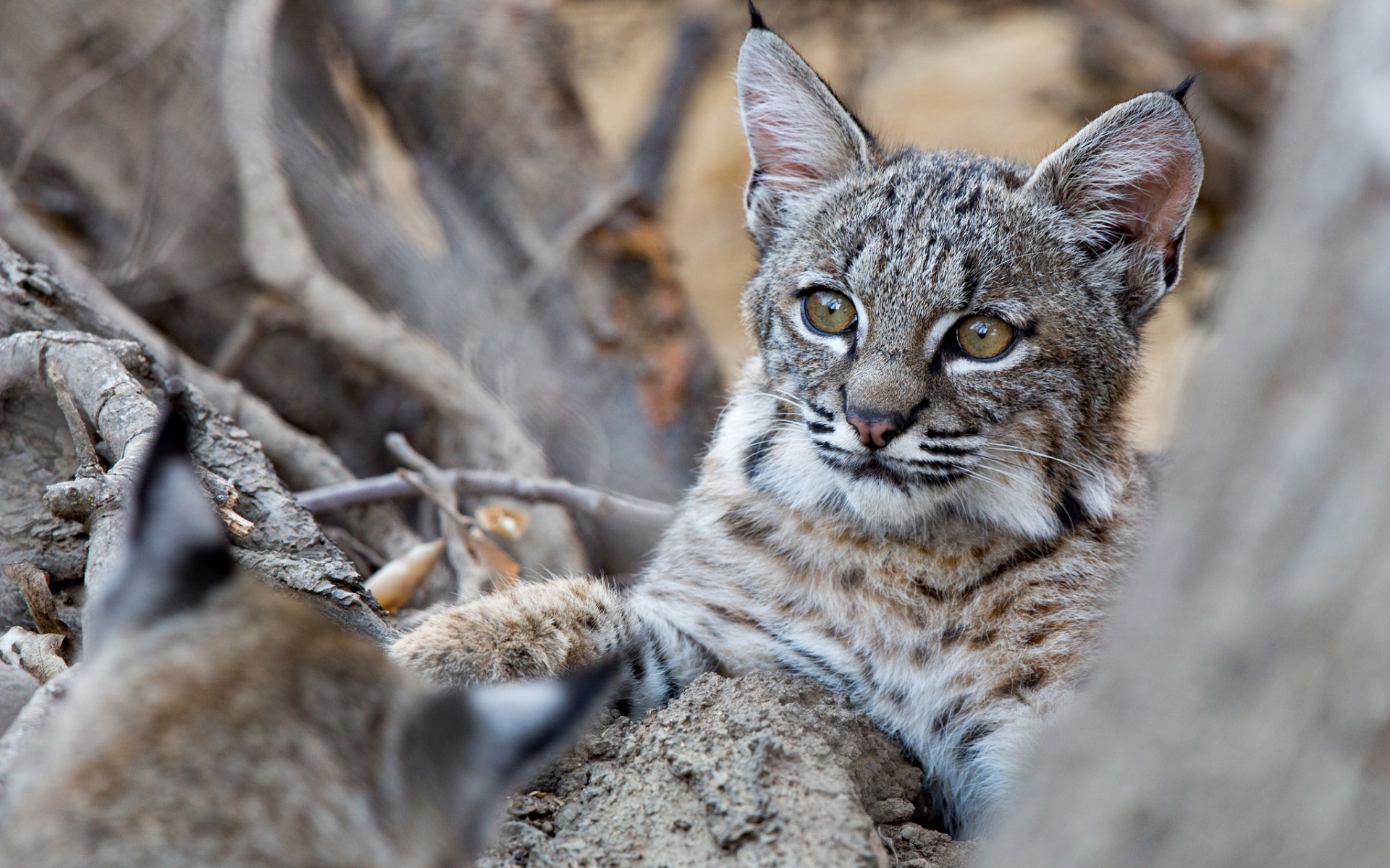 Description: A cat sitting on top of a tree branch next to another cat on the ground near a tree branch.