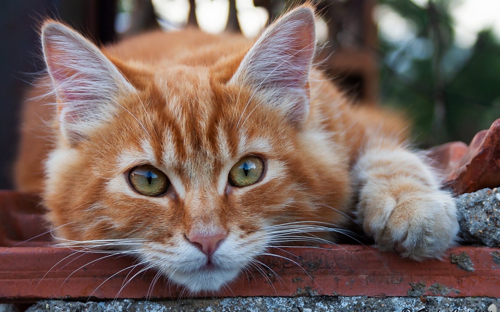 Description: A cat laying on top of a brick wall next to a tree branch and a rock wall with a green eyed cat.