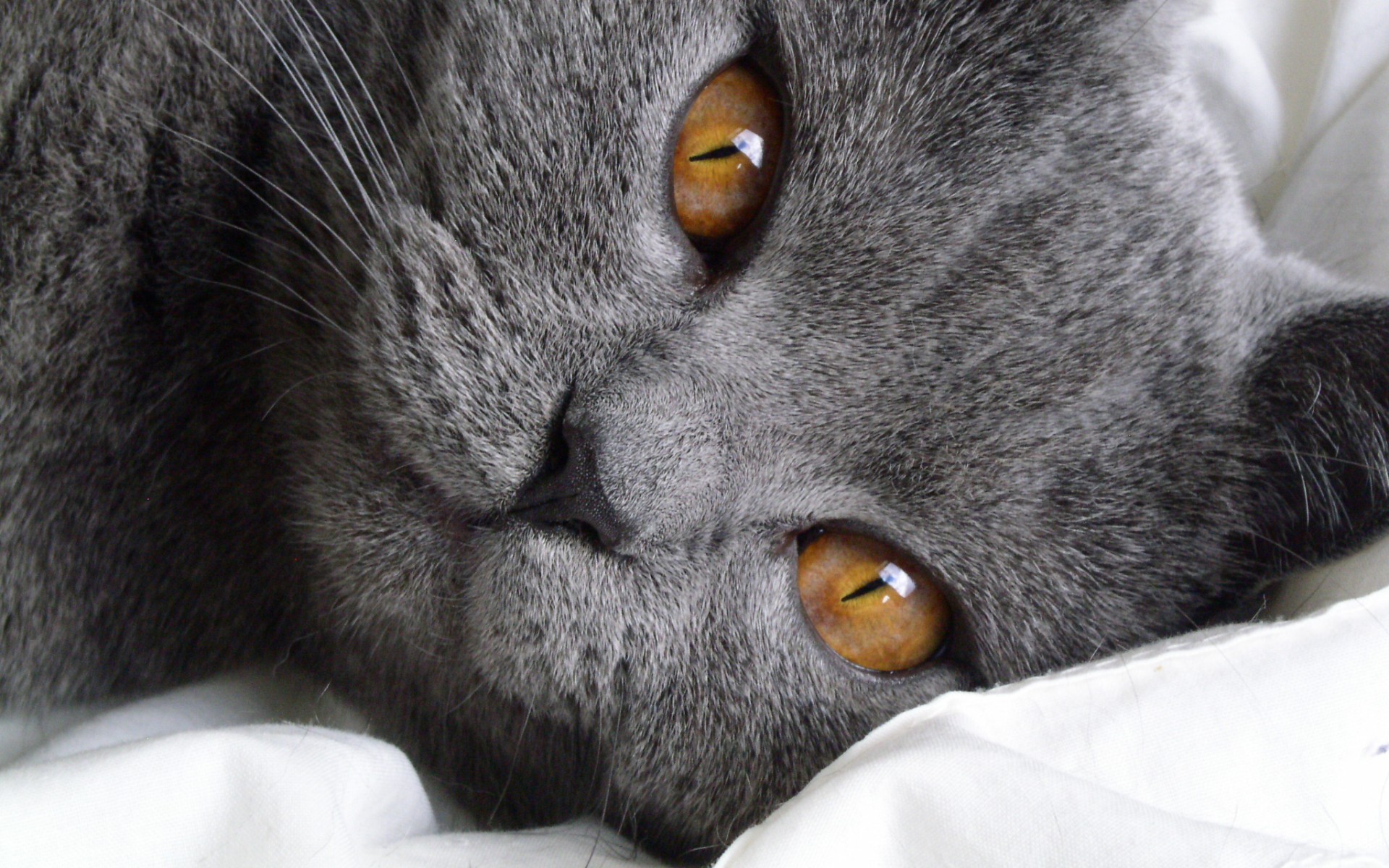 Description: A cat with two brown eyes laying on a bed with white sheets and a white blanket on it's side.