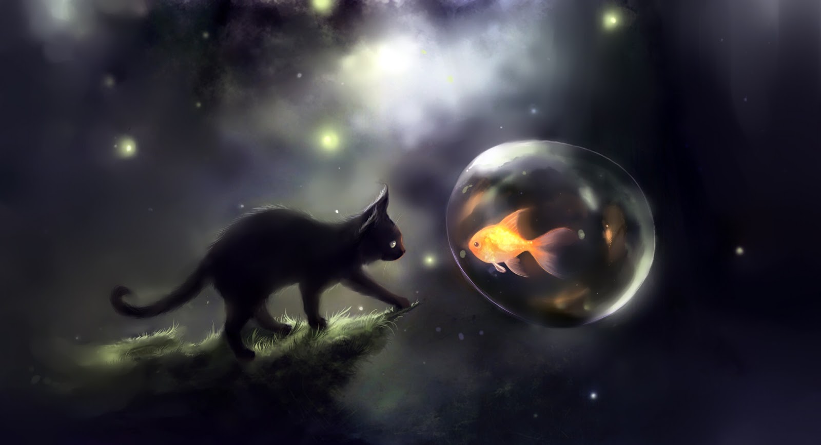 Description: A cat is walking next to a bubble with a fish inside it and a fire in the middle of the bubble.