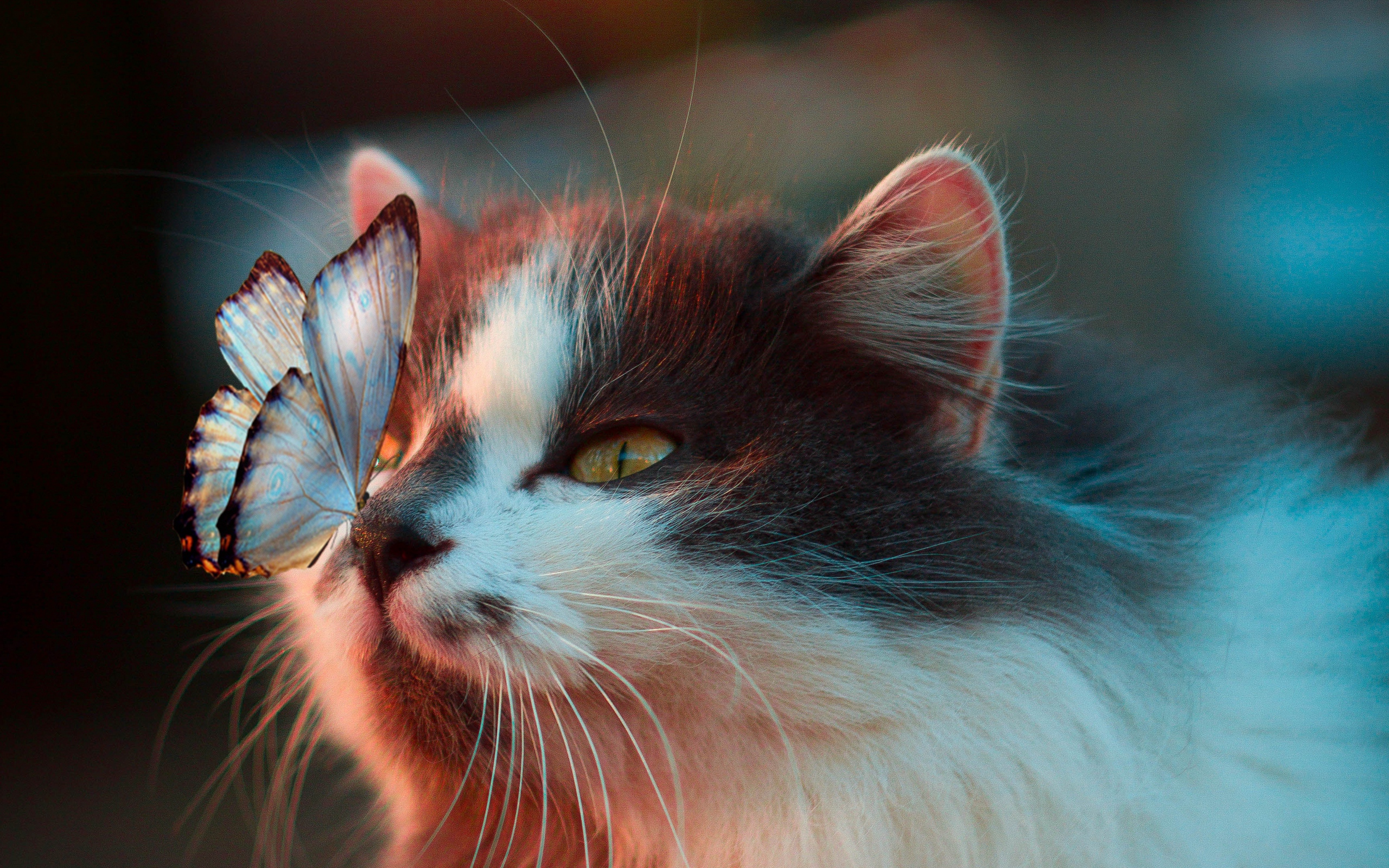Description: A cat with a butterfly on its nose looking up at the sky with a blurry background of the image.