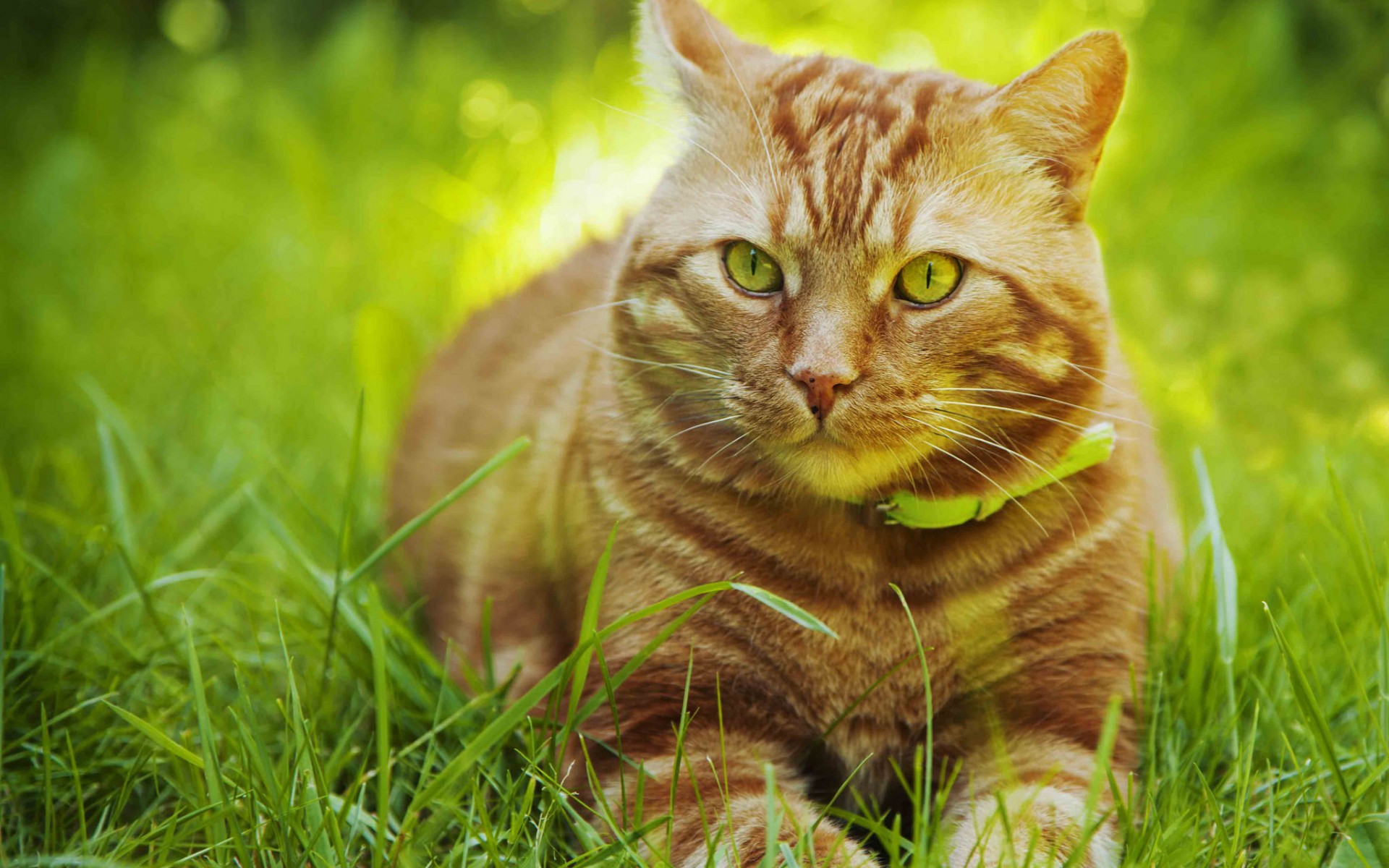 Description: A cat with a collar is sitting in the grass and staring at the camera with a green collar around its neck.