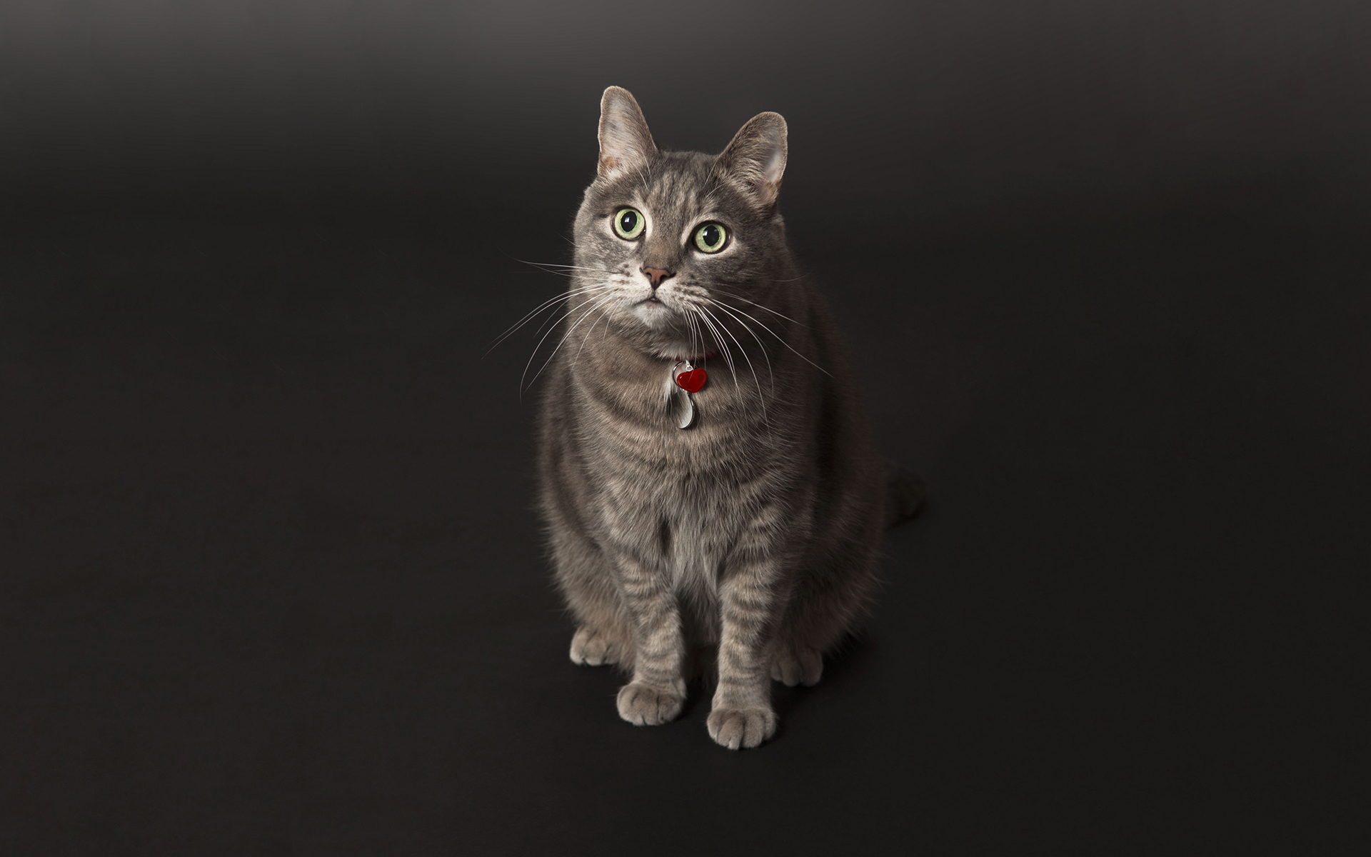 Description: A cat with a collar and a tag on it's collar sitting on a black surface with a black background.