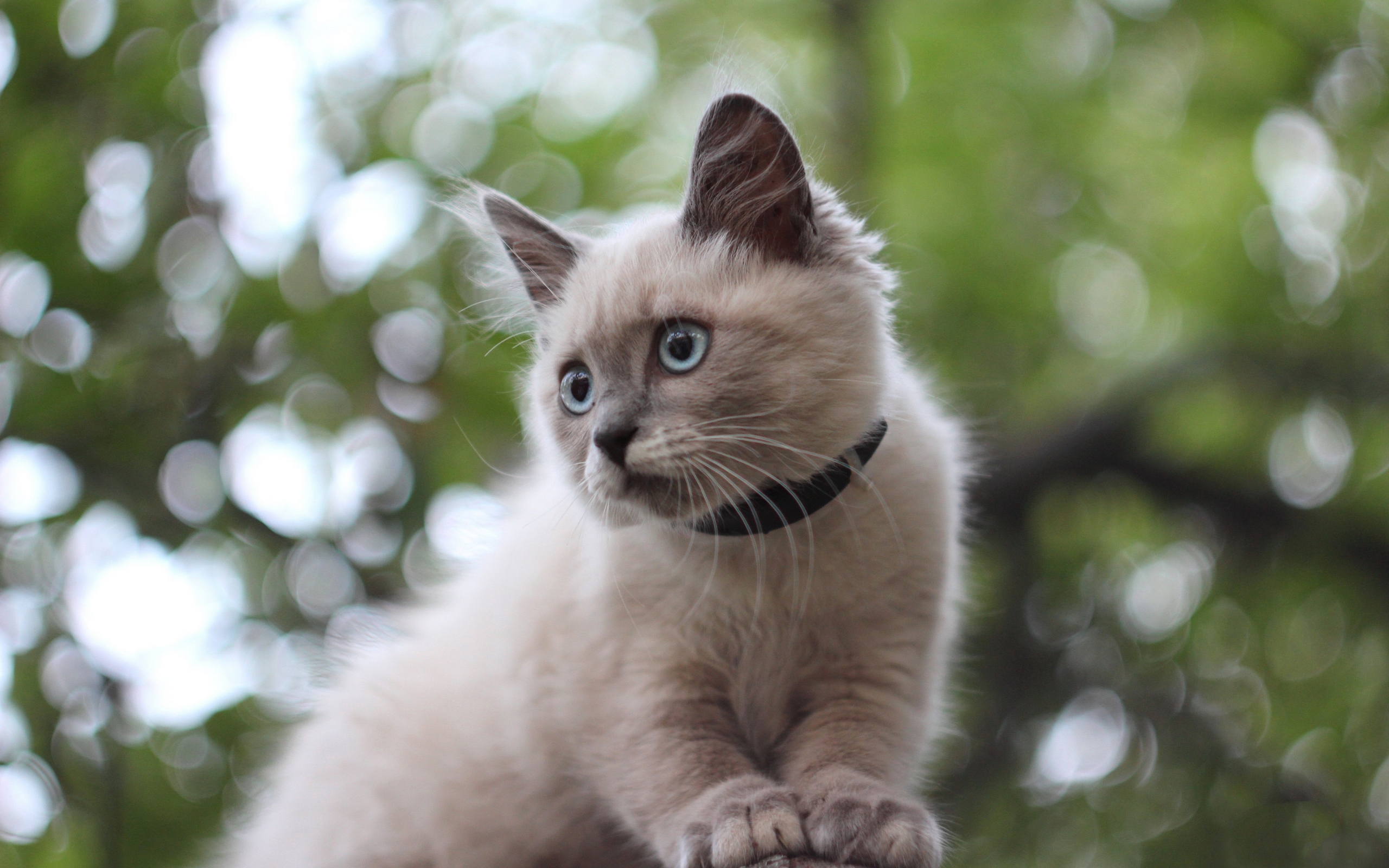 Description: A cat with a collar on sitting on a ledge looking up at the camera with a tree in the background.