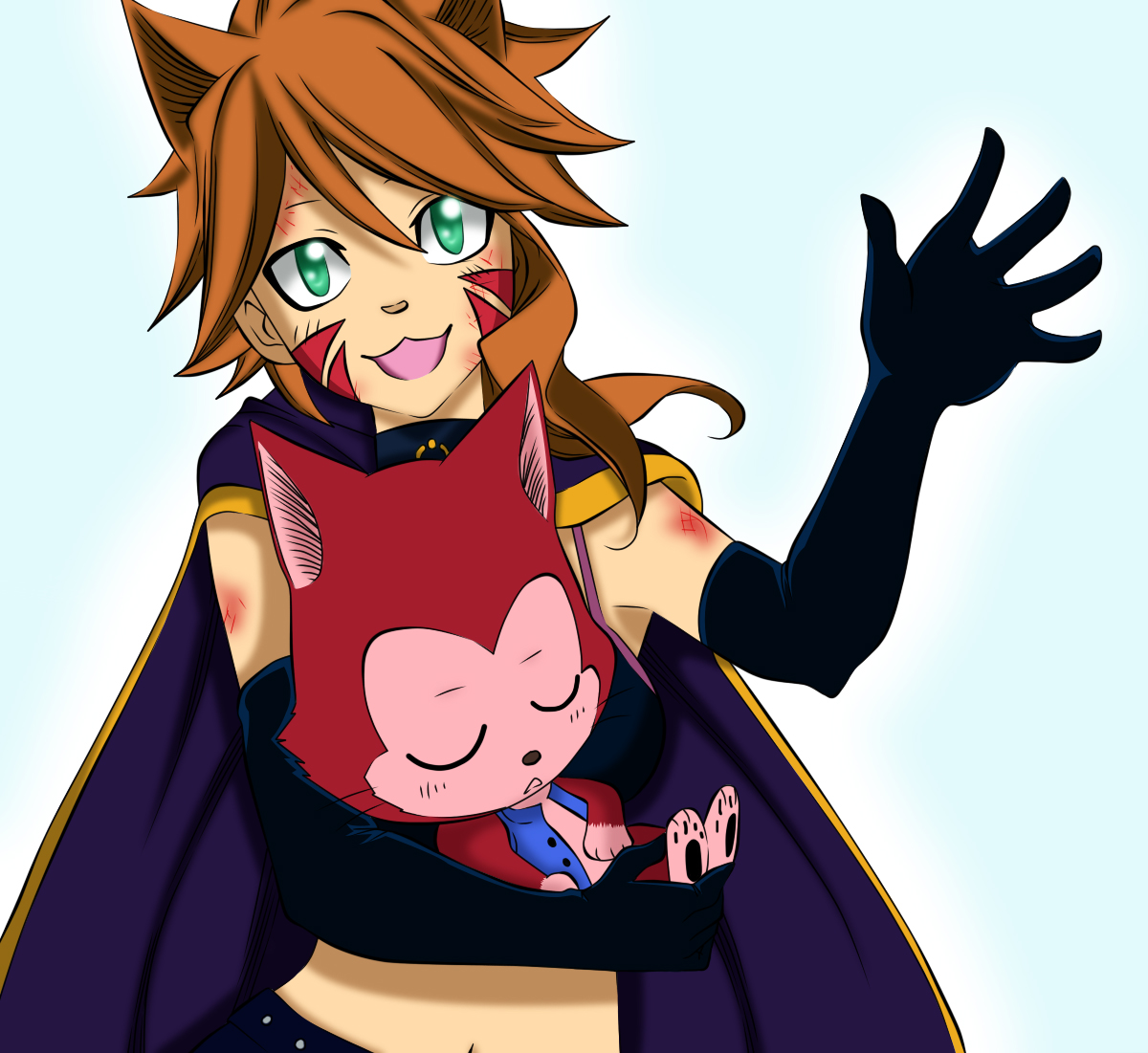 Description: A woman in a costume holding a cat and a cat face on her chest and a cat on her chest.