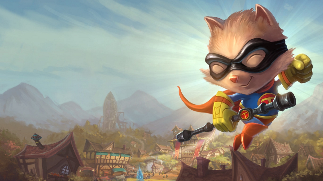 Description: A cat in a costume flying over a town with a sky background and a mountain range in the background.
