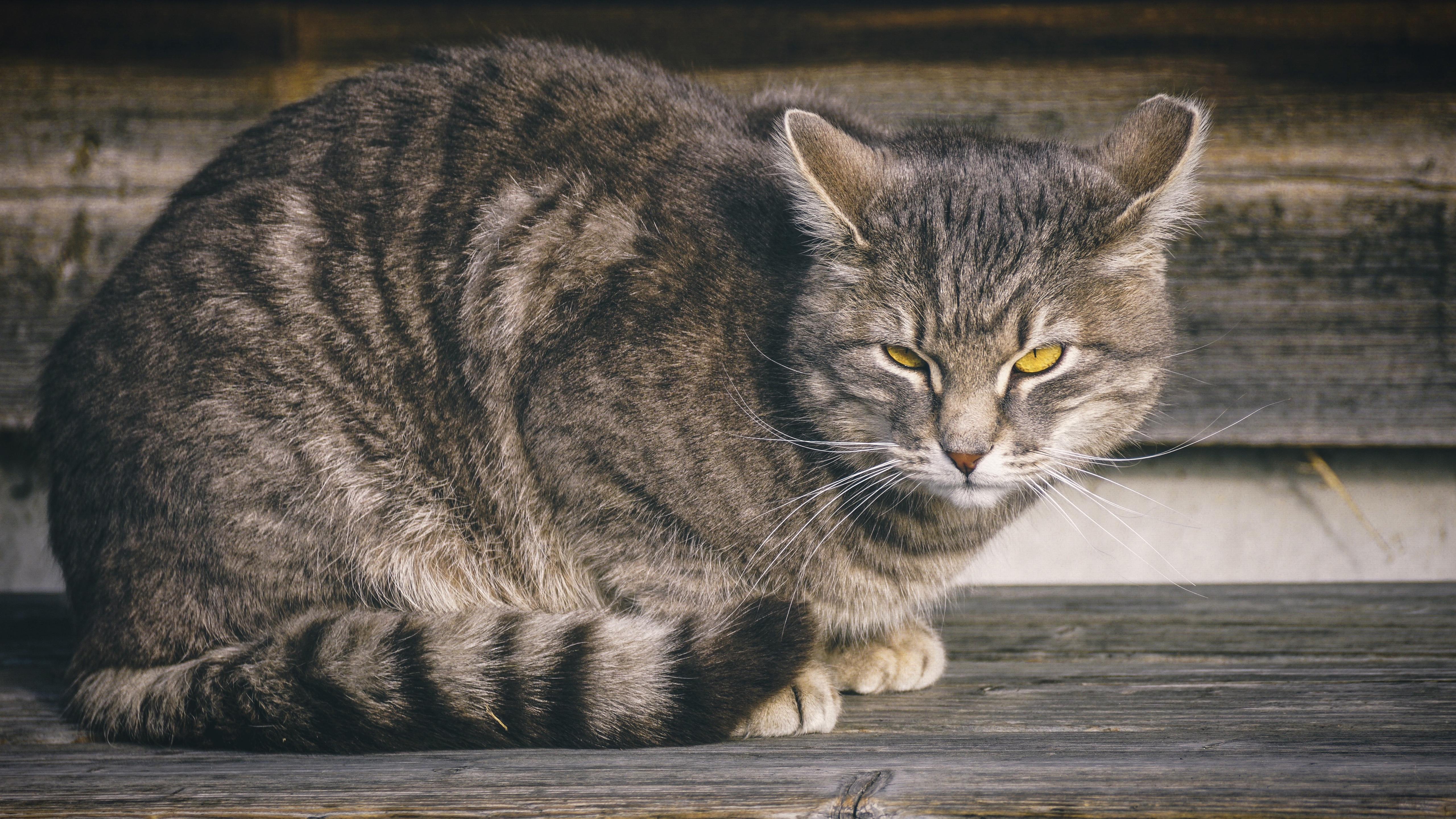 Description: A cat sitting on a wooden deck looking at the camera with a serious look on its face and eyes.