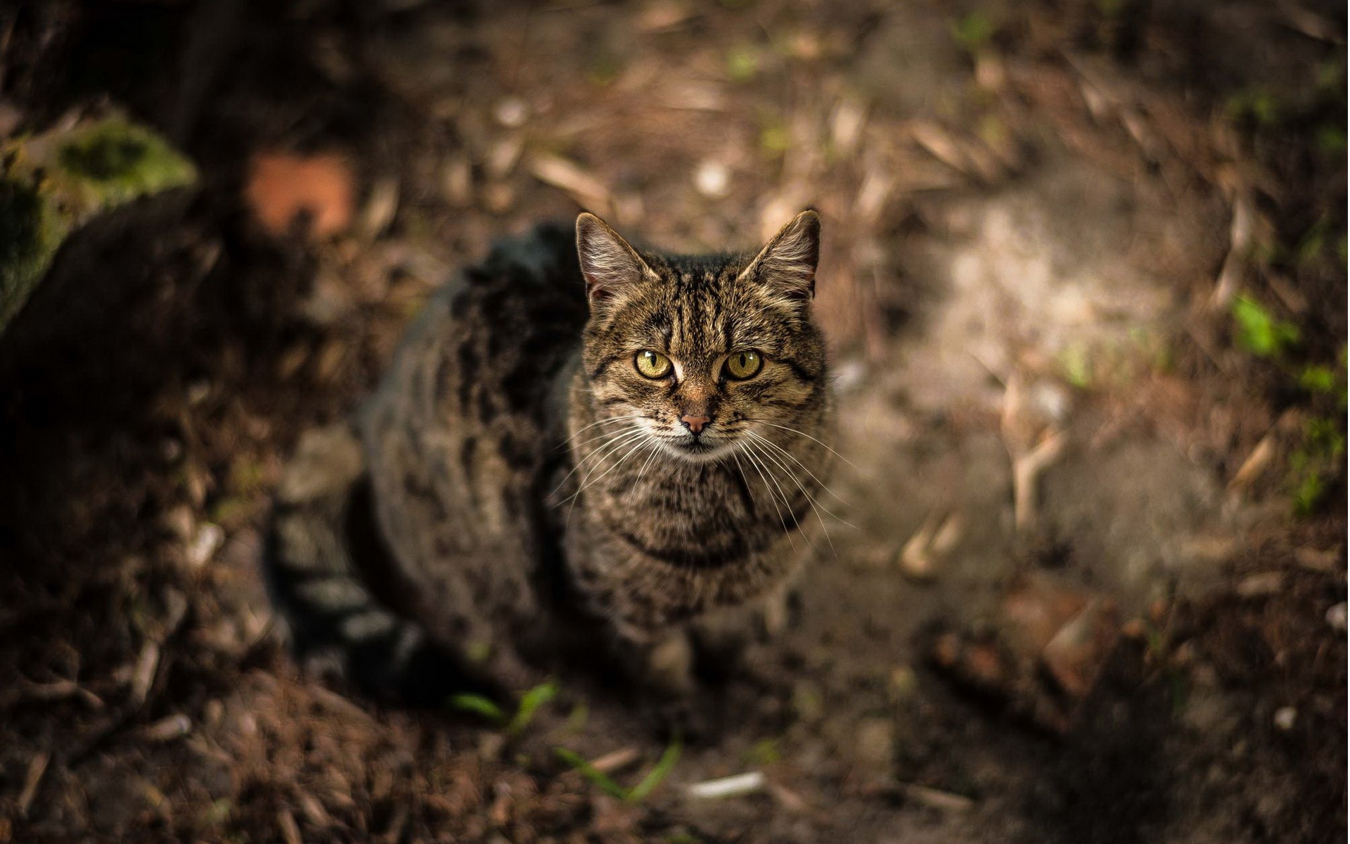 Description: A cat is sitting in the dirt looking at the camera man's eye is on the ground and the cat is looking at the camera man.