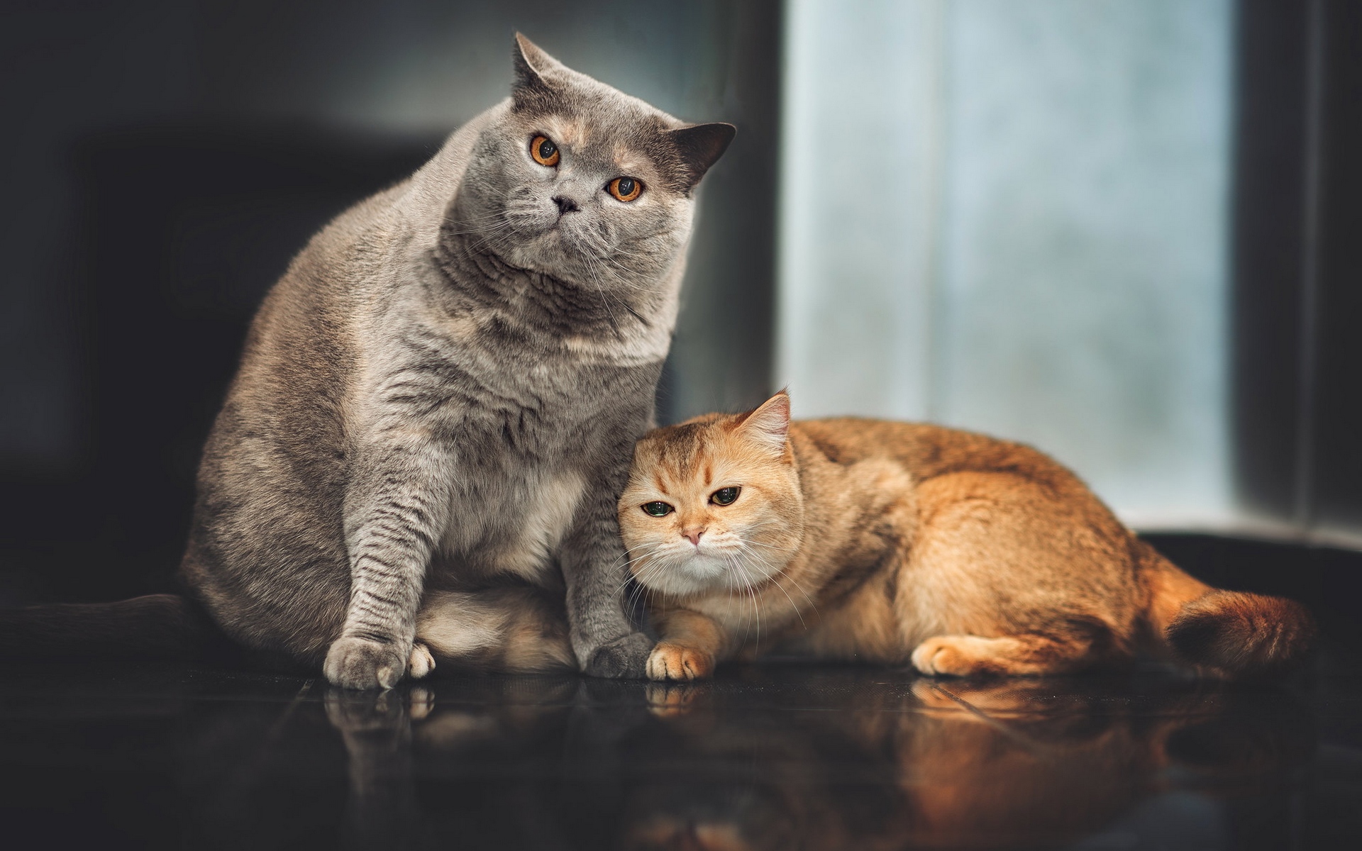 Description: A cat and a cat laying on a floor next to each other.