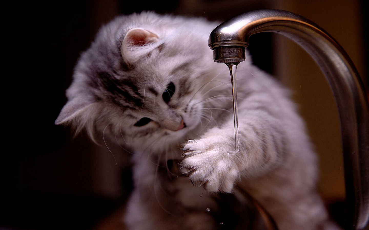 Description: A cat is drinking water from a faucet that is hanging from a faucet handle and is on a table.