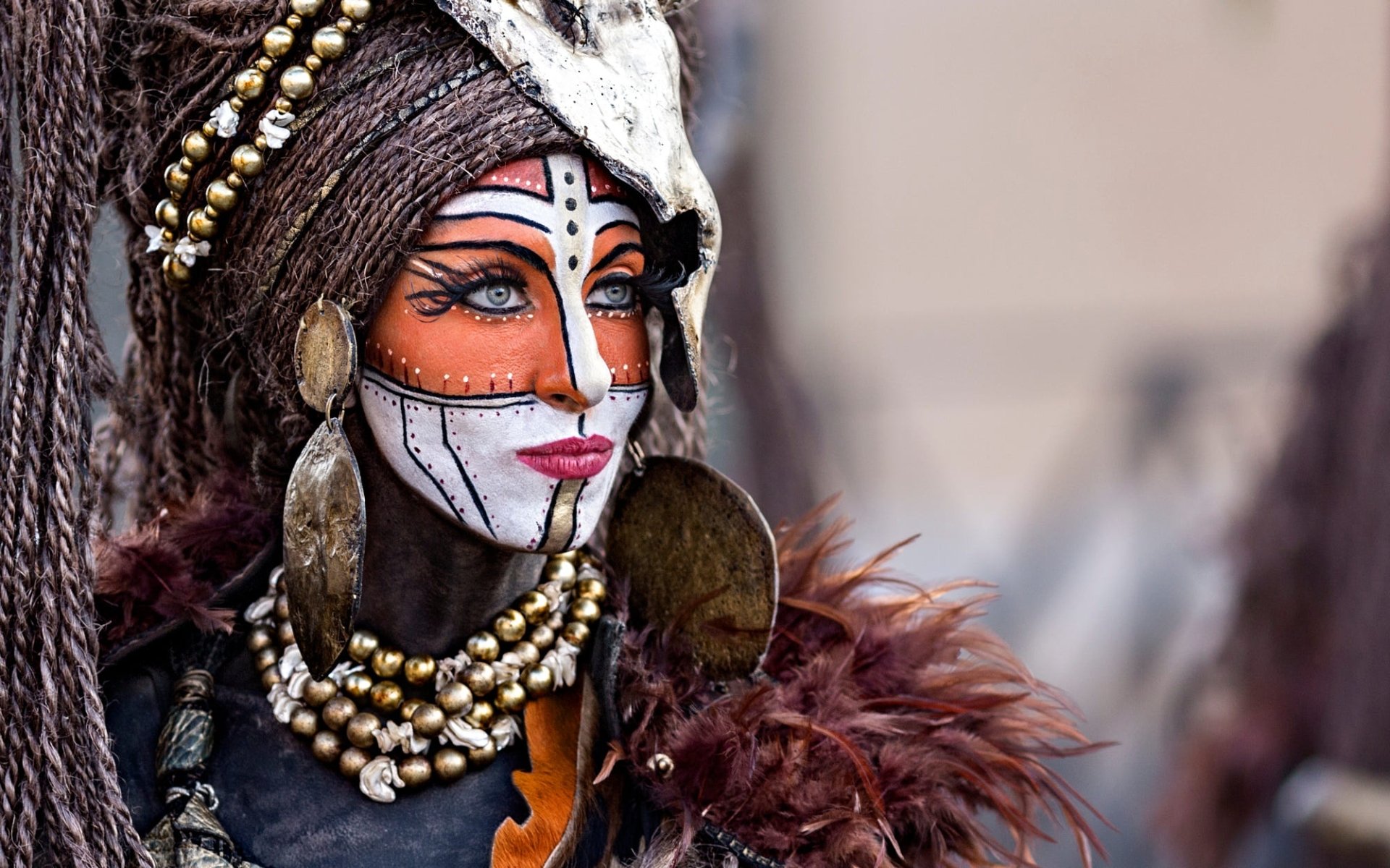 Description: A woman with a face painted like a cat and feathers on her head and a bird on her head.
