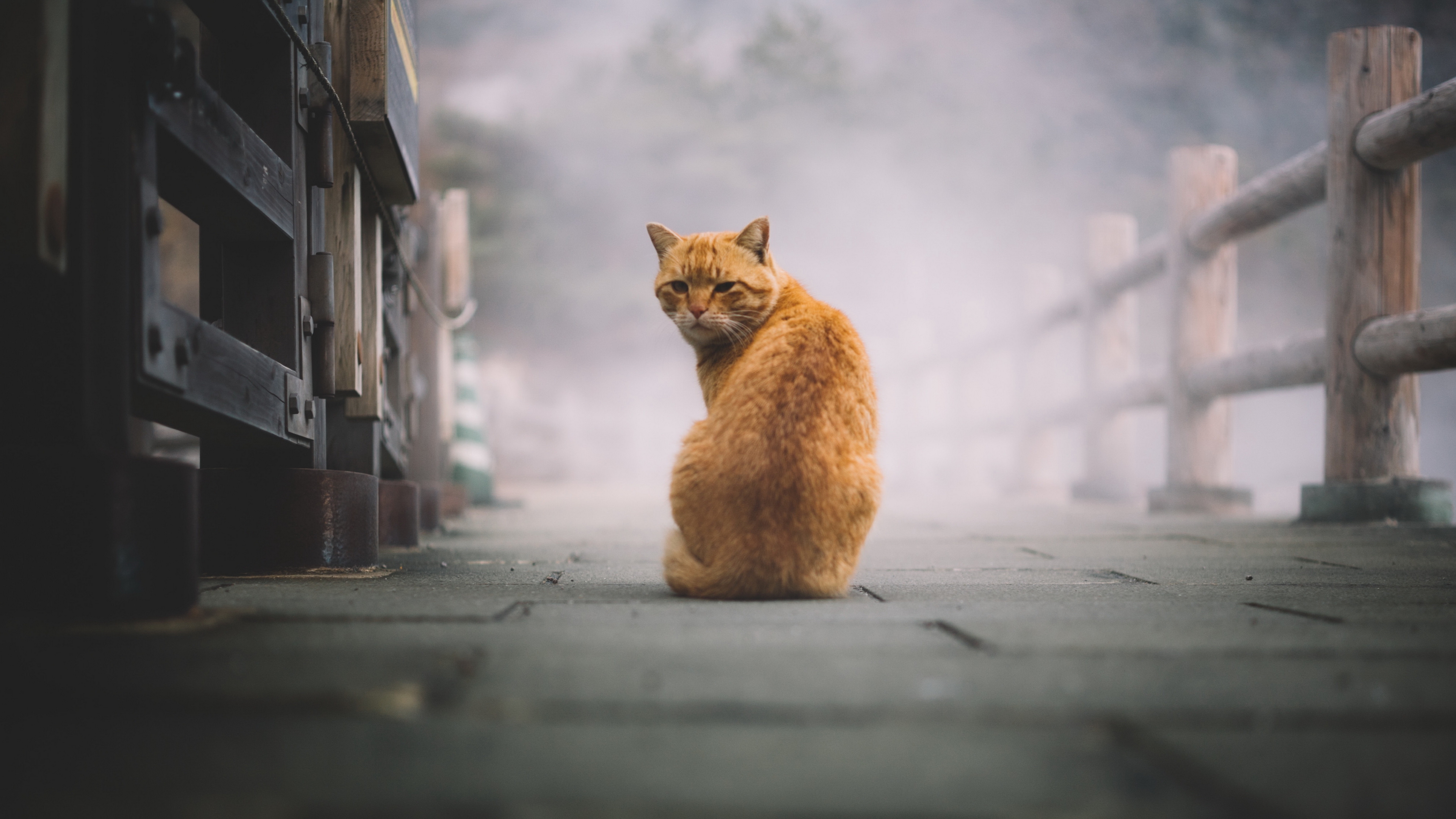 Description: A cat sitting on the ground in front of a fence and gate with fog in the background and a person walking away.