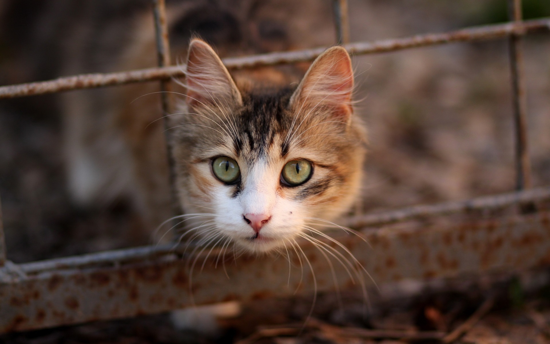 Description: A cat looking out from behind a fence with a green eyed cat in the background and a rusty fence.
