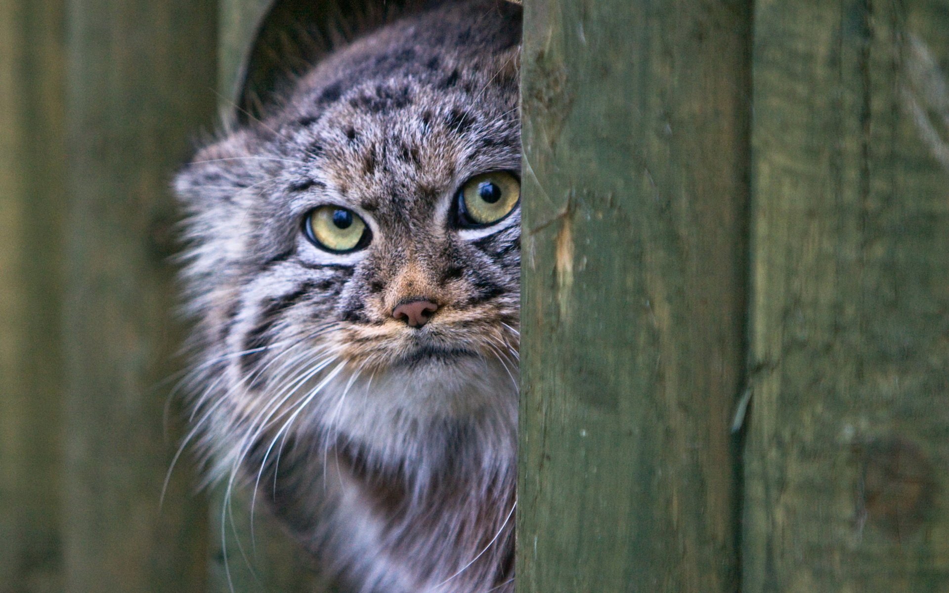 Description: A cat looking out of a wooden fence with its eyes wide open and a green eyed cat looking out of the fence.