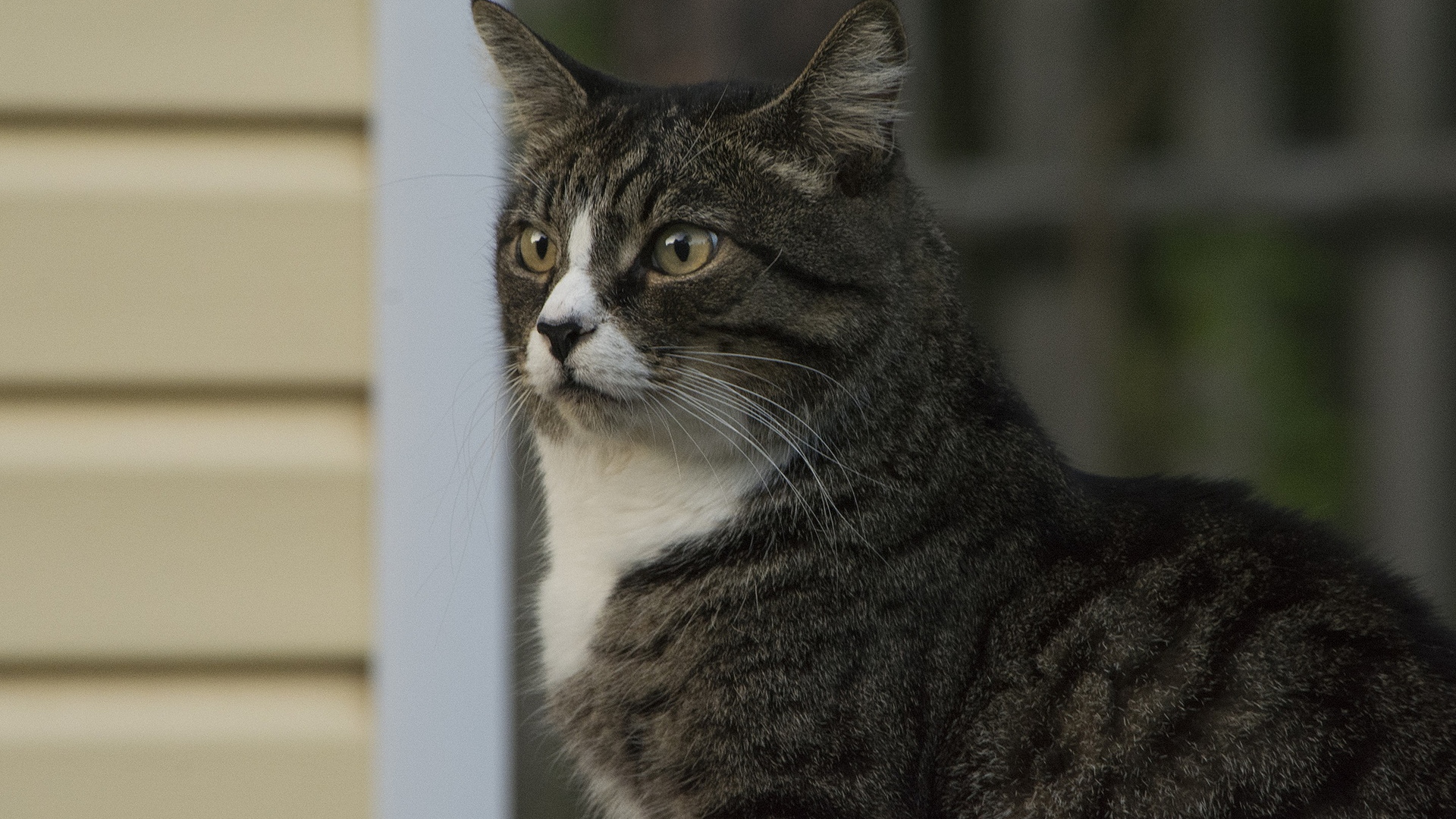 Description: A cat is looking at something while standing outside of a house with a fence in the background and a window in the foreground.