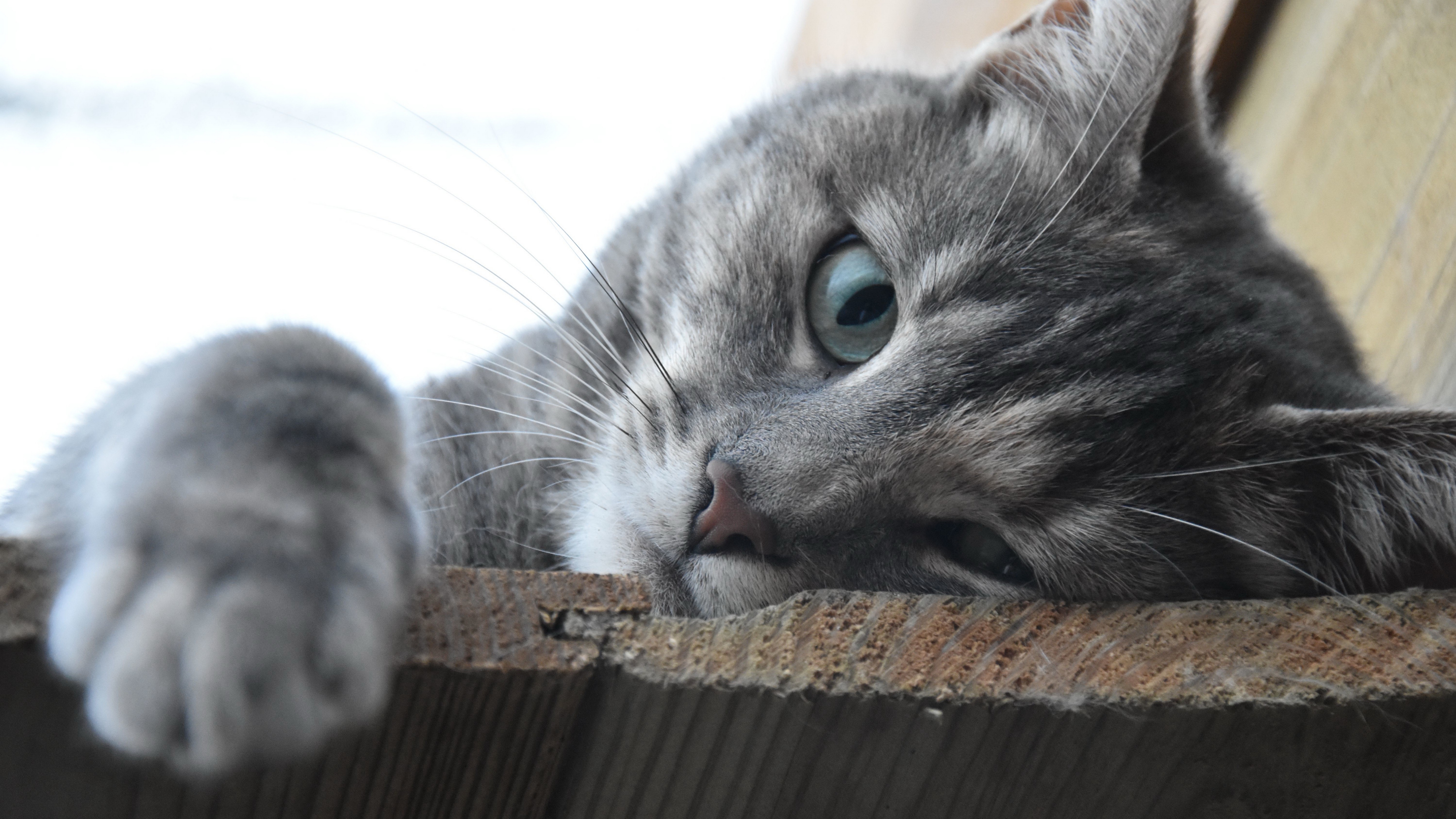 Description: A cat with its paw on a wooden fence looking over the top of it's head and paw.