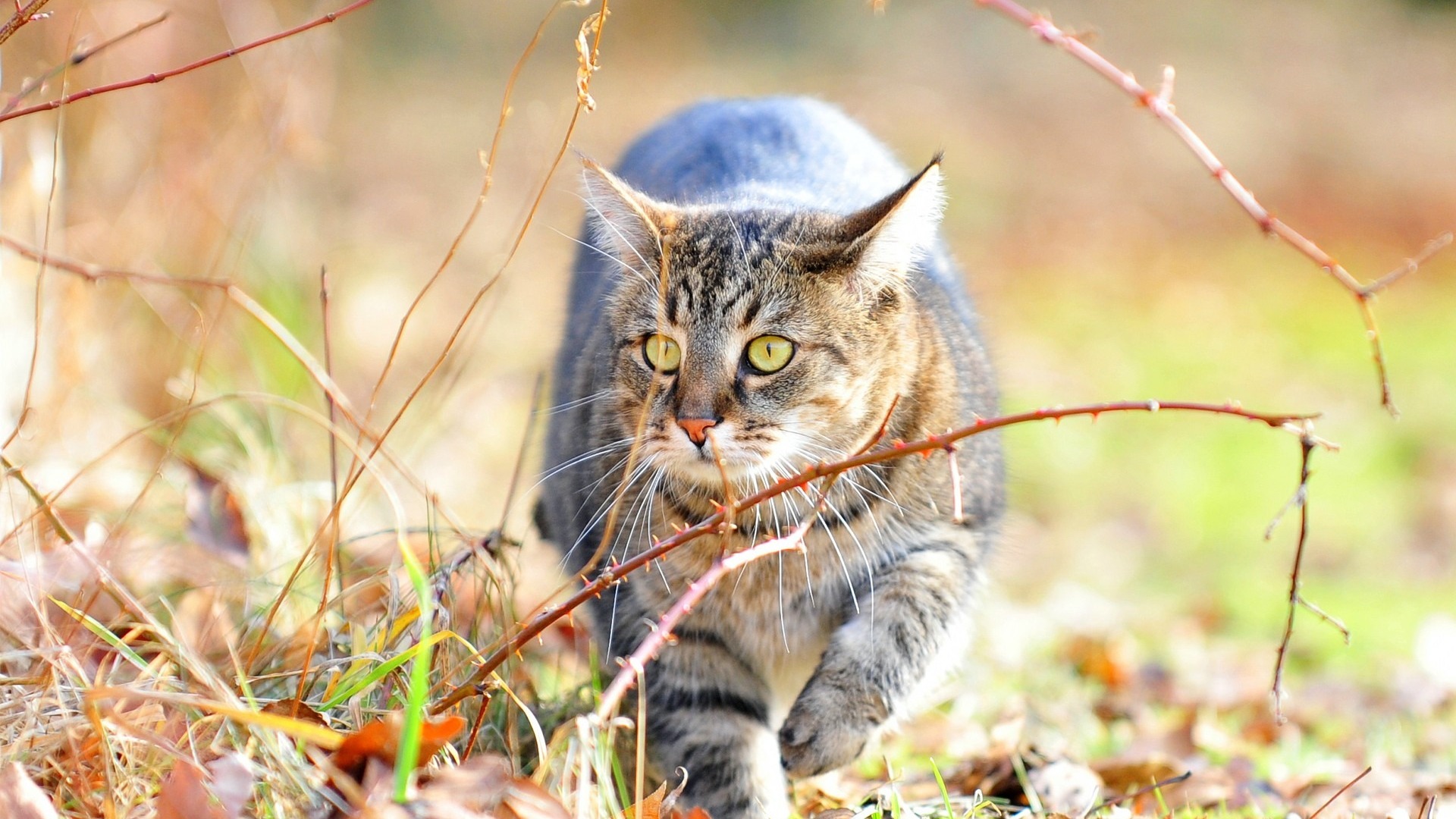 Description: A cat walking through a field of grass and leaves with a blurry background of grass and leaves.