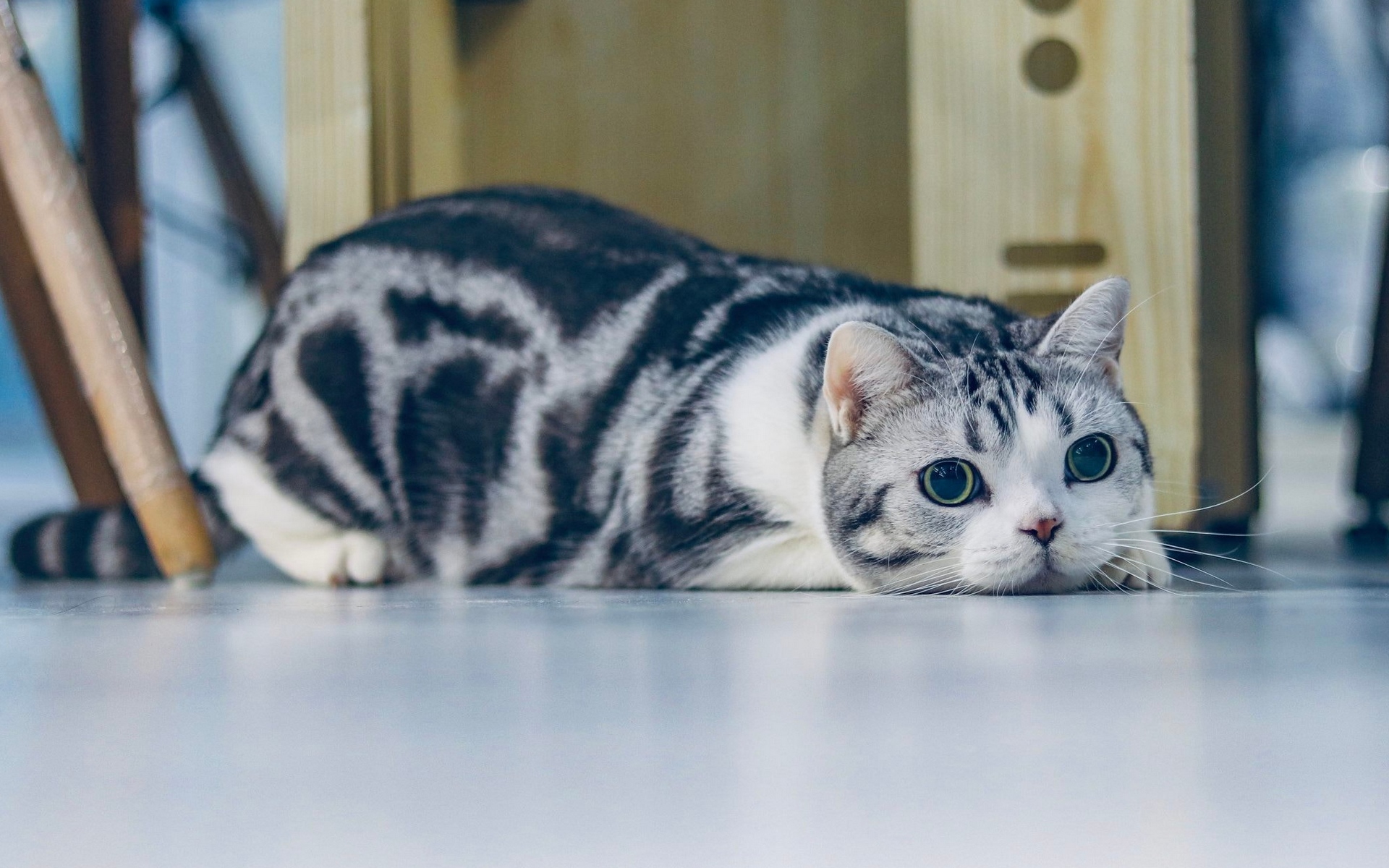 Description: A cat laying on the floor next to a chair and a door with a clock on it's side.