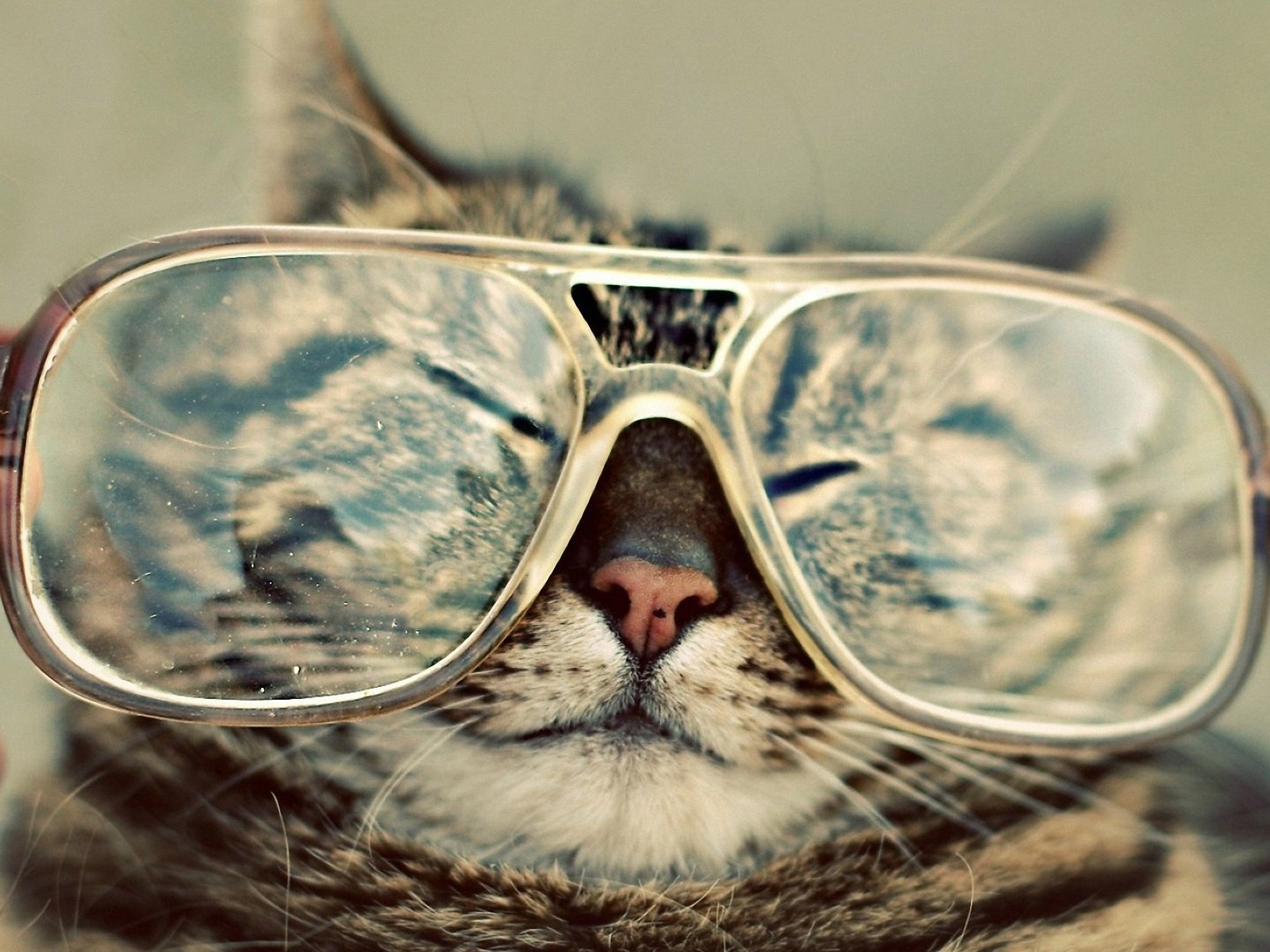 Description: A cat wearing glasses with its eyes closed and looking up at the camera with its head tilted to the side.