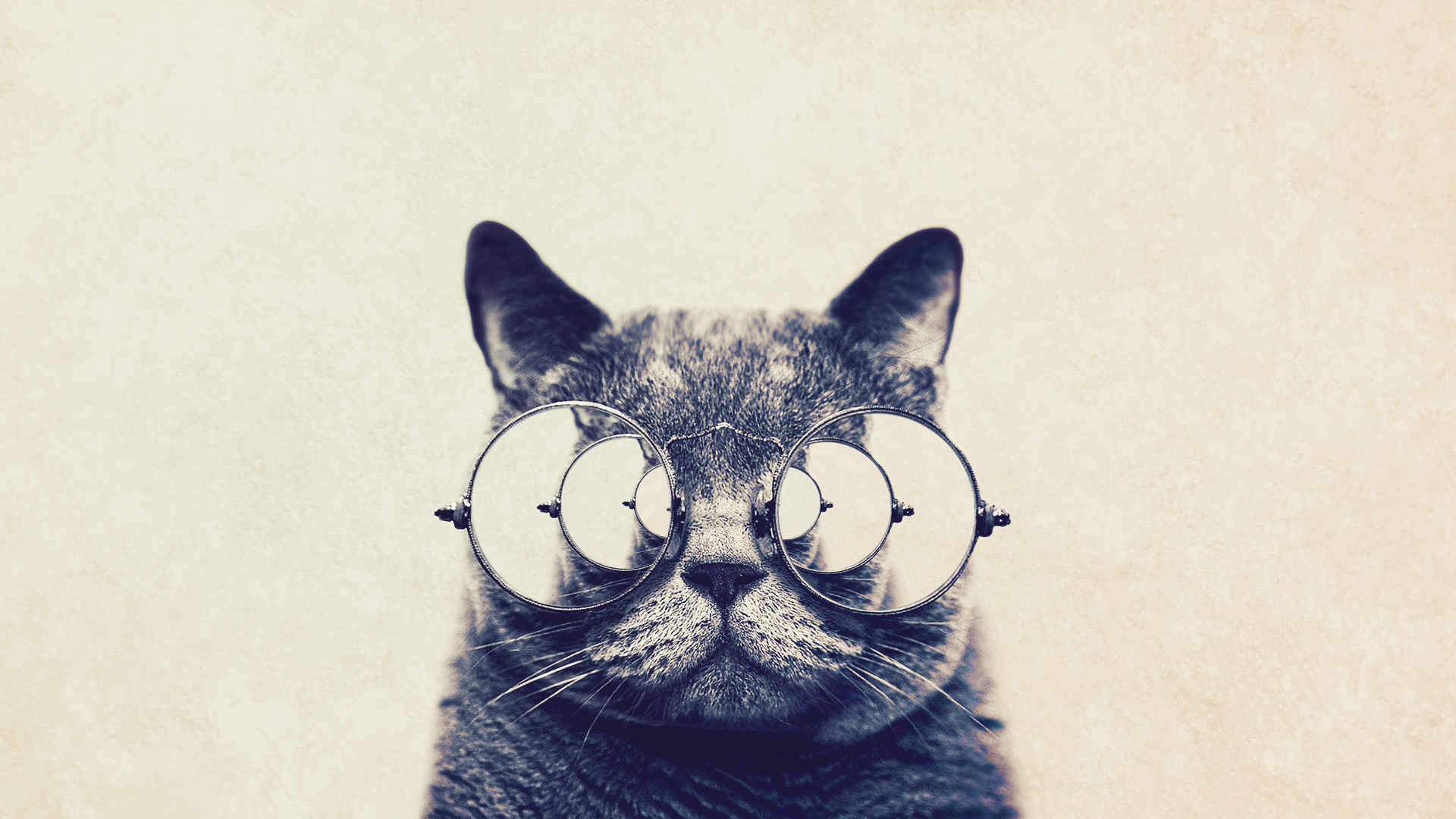 Description: A cat wearing glasses with a cat's face behind it's glasses.